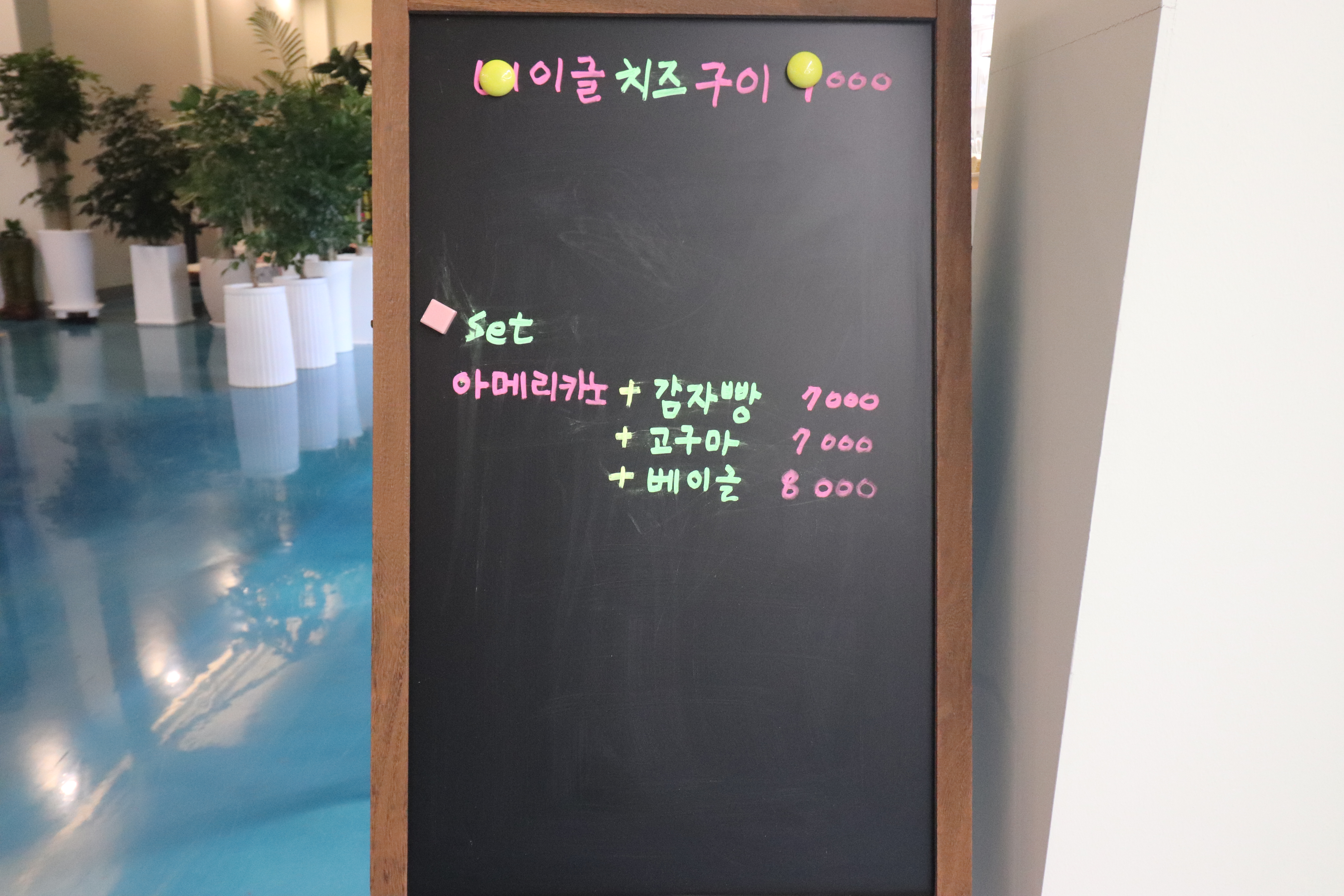 카페 곳곳을 좀 둘러보았습니다. 블랙보드에 세트 메뉴 안내와 시그니처 메뉴 안내 등이 있어서 읽어보았습니다.