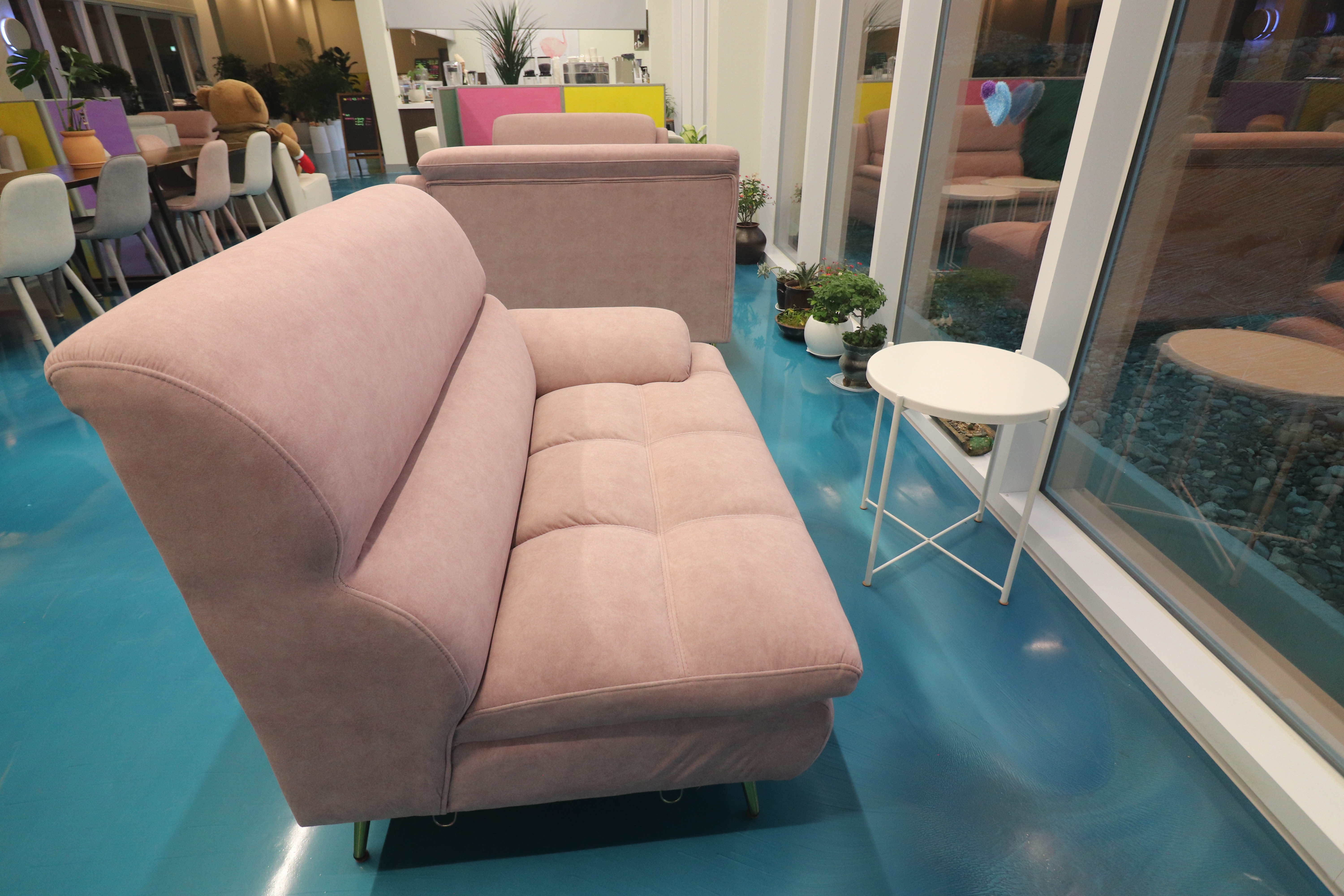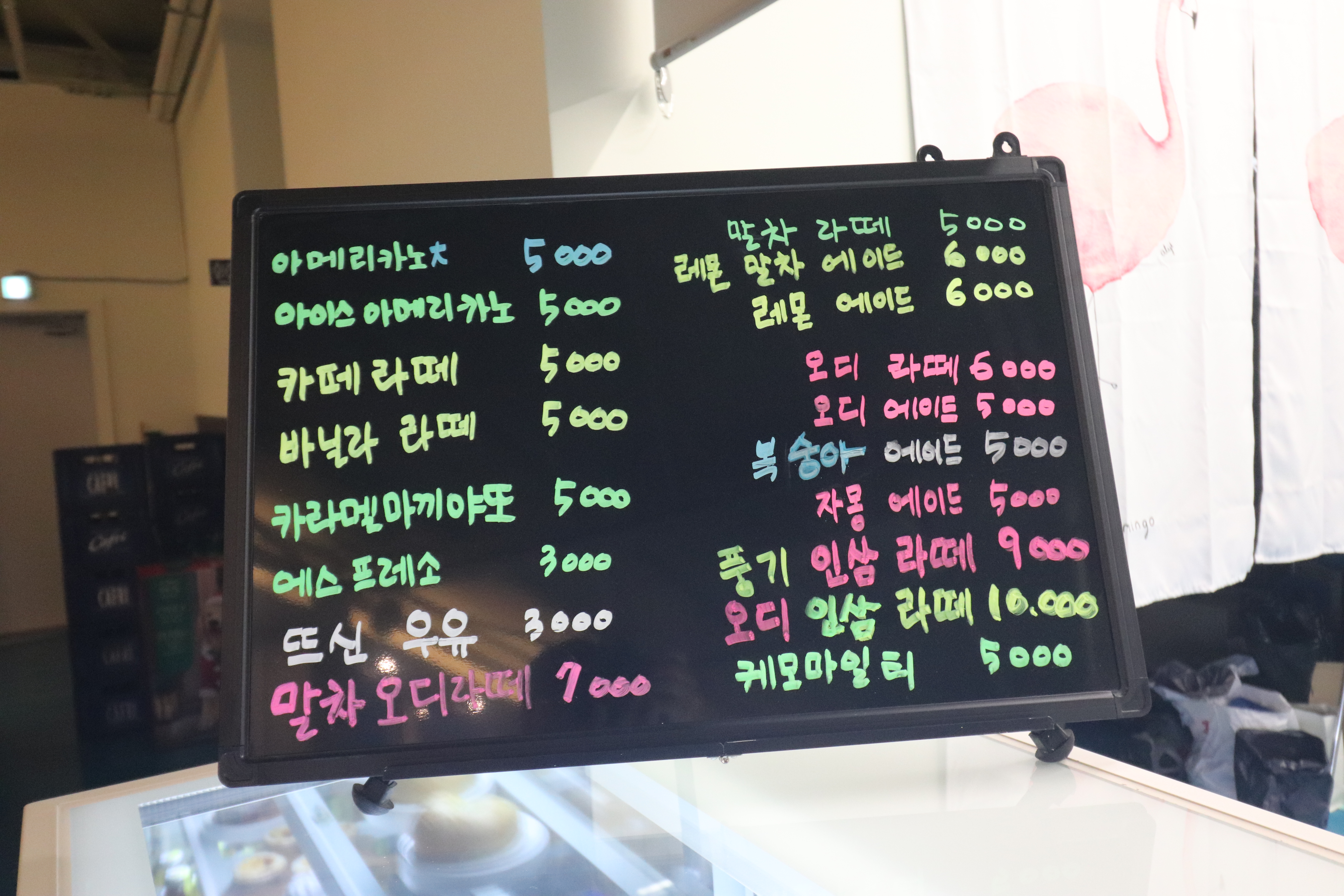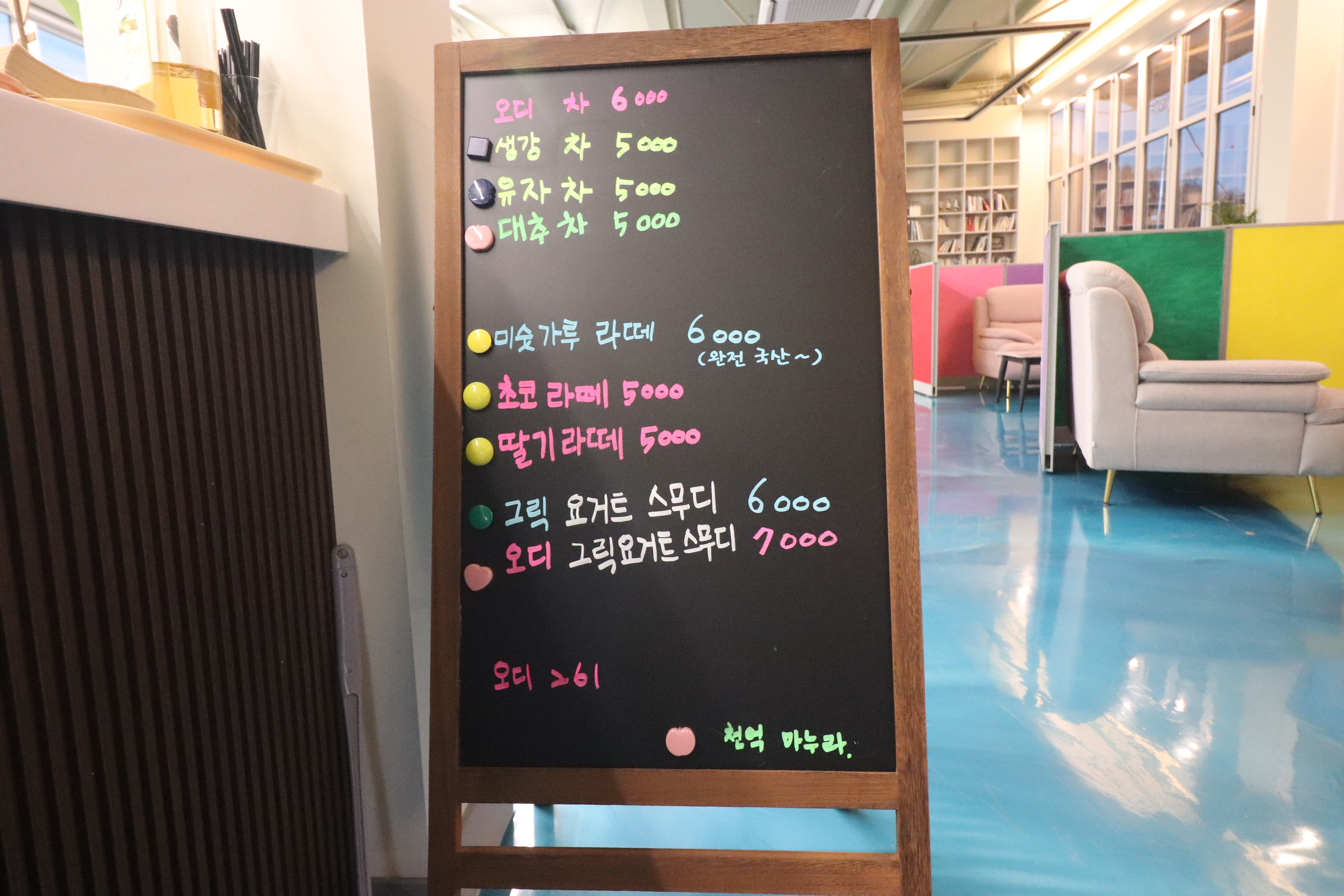 예천 오디261은 신상 카페라서 그런지 인테리어가 현대식이고 알록달록 예뻤어요. 예천에도 이런 곳이...? 란 생각이 들더라고요. 밖에서 보는 것보다 안에서 보는게 훨씬 넓고 쾌적한 공간처럼 느껴졌습니다. 벽면을 가득채운 통창 때문일지도 모르겠네요.