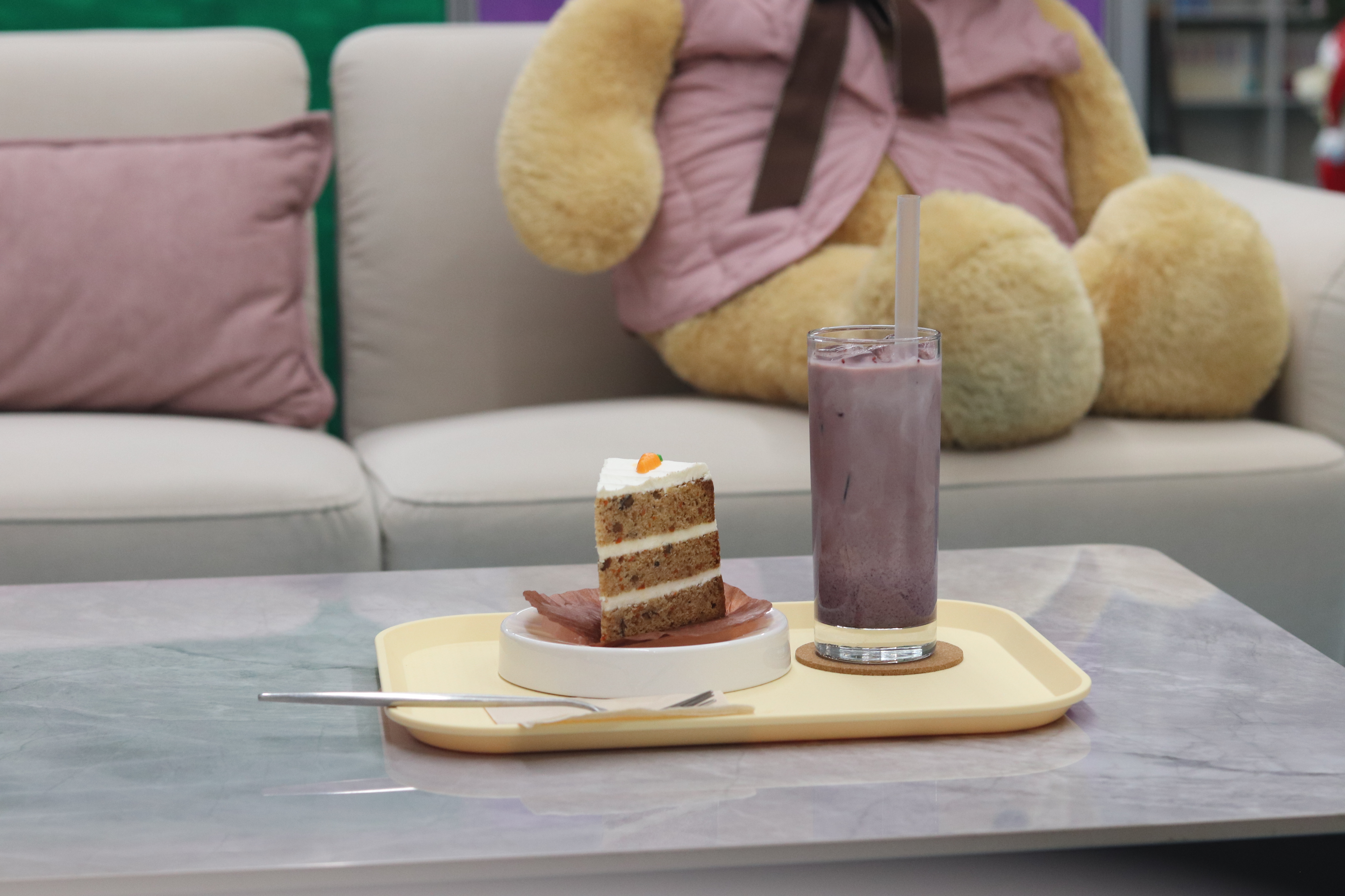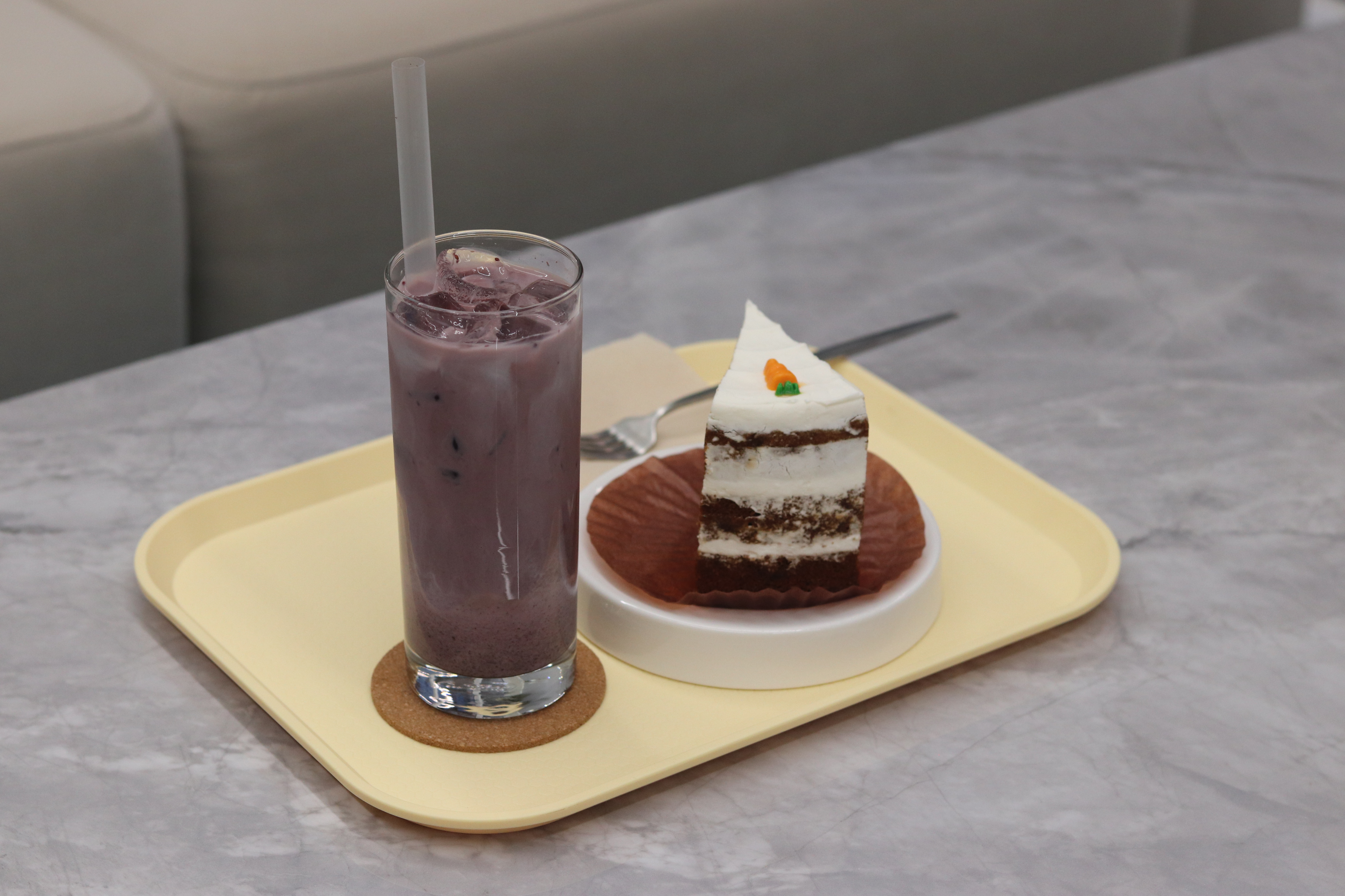 당근케이크는 시나몬 향이 나는 꾸덕한 크림치즈와 고소하고 쫀득한 식감이었습니다. 당근케이크 위에 올라간 당근 모양이 너무 귀여웠어요. 케이크 단면을 보니 채 썬 당근과 견과류가 콕콕 박혀 있는 게 보였습니다. 시트가 퍽퍽하지 않고 촉촉하다고 보시면 되고 당근 케이크 특유의 시나몬 향이 은은하게 감돌면서 중간중간 씹히는 견과류의 고소함이 나는 그런 맛입니다. 오디 라떼가 달콤한 편이라 케이크가 너무 달면 물리지 않을까 걱정했는데, 당근 케이크의 담백하면서도 깊은 맛이 오디 라떼와 의외로 궁합이 좋더군요.