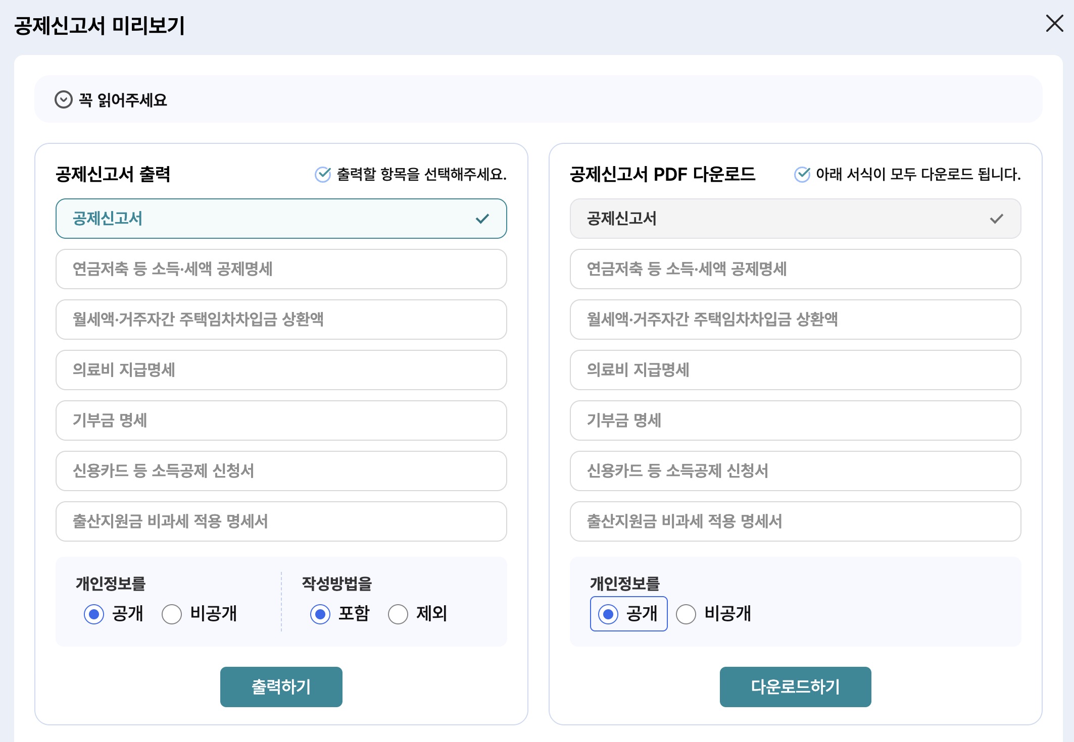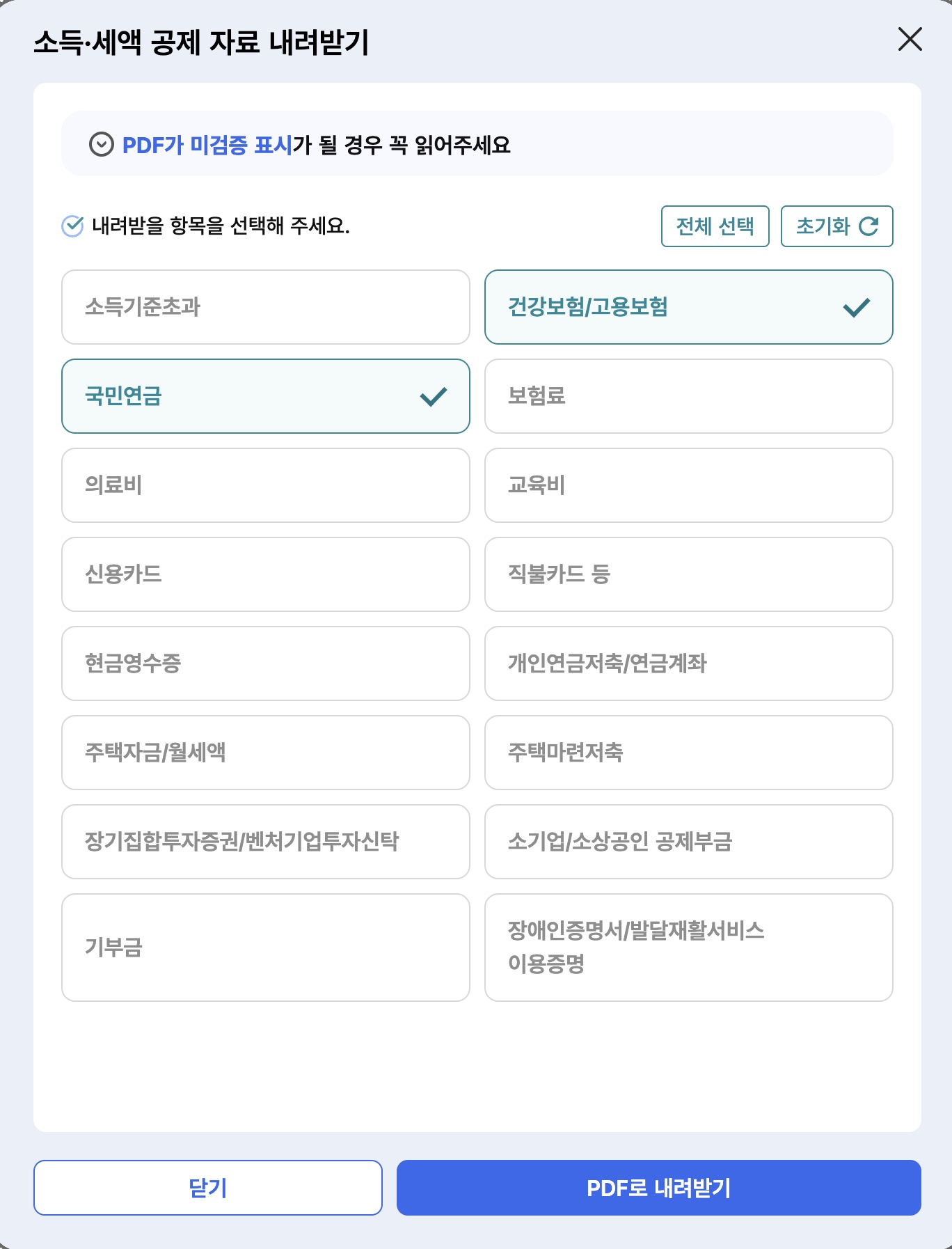 여기까지 하게되면 총 2개의 PDF 파일을 받게 된다. 첫번째는 `공제신고서`이고 두번째는 `공제신고자료`인데 이 부분은 연말정산 간소화 자료 페이지에서 다운로드가 가능하다. 공제자료에서 꼭 내가 원하는 항목만 포함되어 있는지 봐야하고 뺄 건 다 빼고 신고하는게 중요!