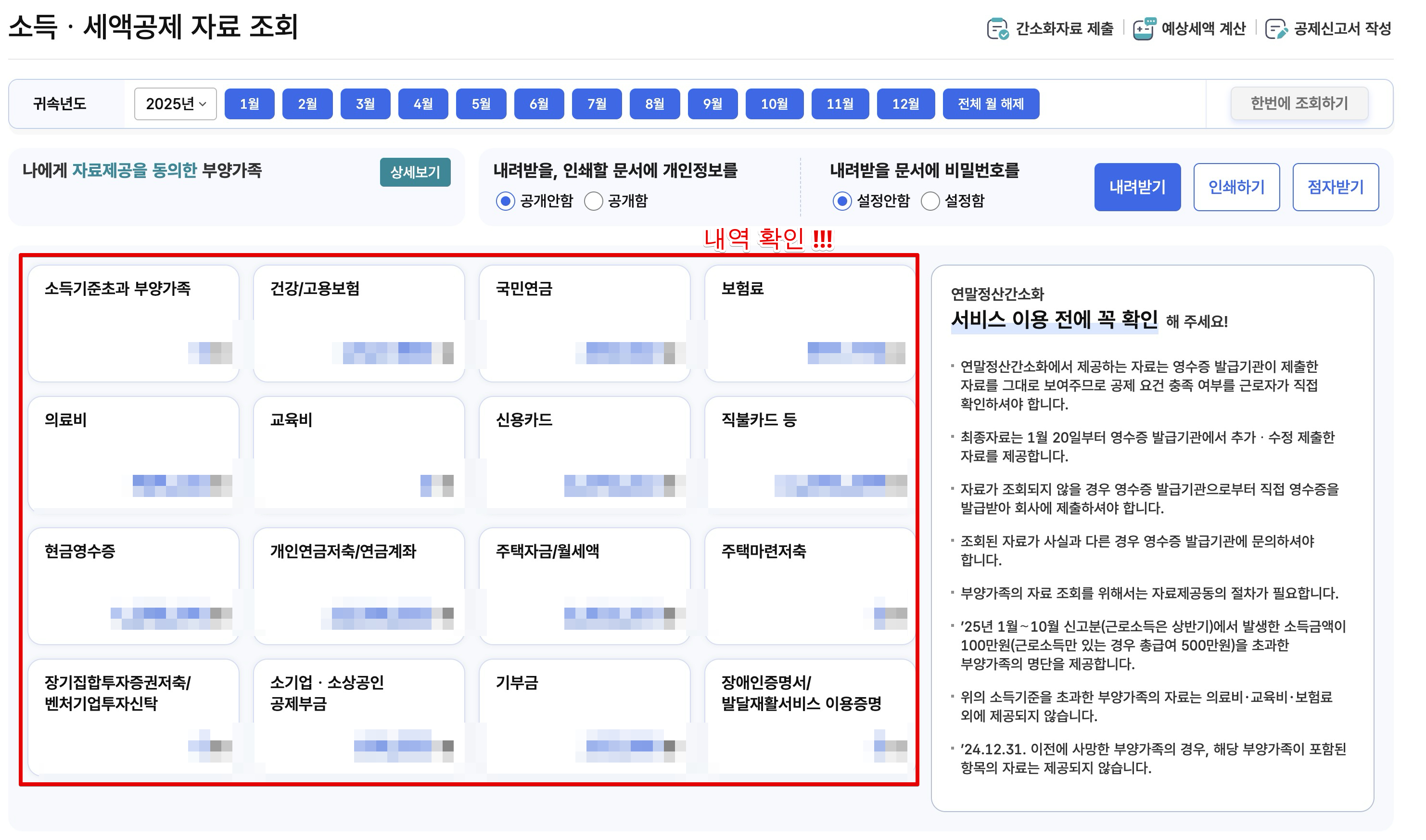 ↑ 일단 2024년 버전으로 쓴 글을 읽어보고 오셔야한다. 전체적으로 흐름이 똑같으므로 이 흐름대로 연말정산 진행한다고 보시면 된다. 2025년이었던 작년부터 국세청 홈택스 시스템과 화면 구성 인터페이스가 많이 달라지게 되면서 버튼 배치나 메뉴 구성 등이 약간 달라진 부분이 있어서 이번 업데이트 글에서 정리해서 다시 올리려고 하고 있다. 그럼에도 진행하는 방식 자체는 이전과 똑같아서 이전 글을 읽어보면 도움이 될 것이다.