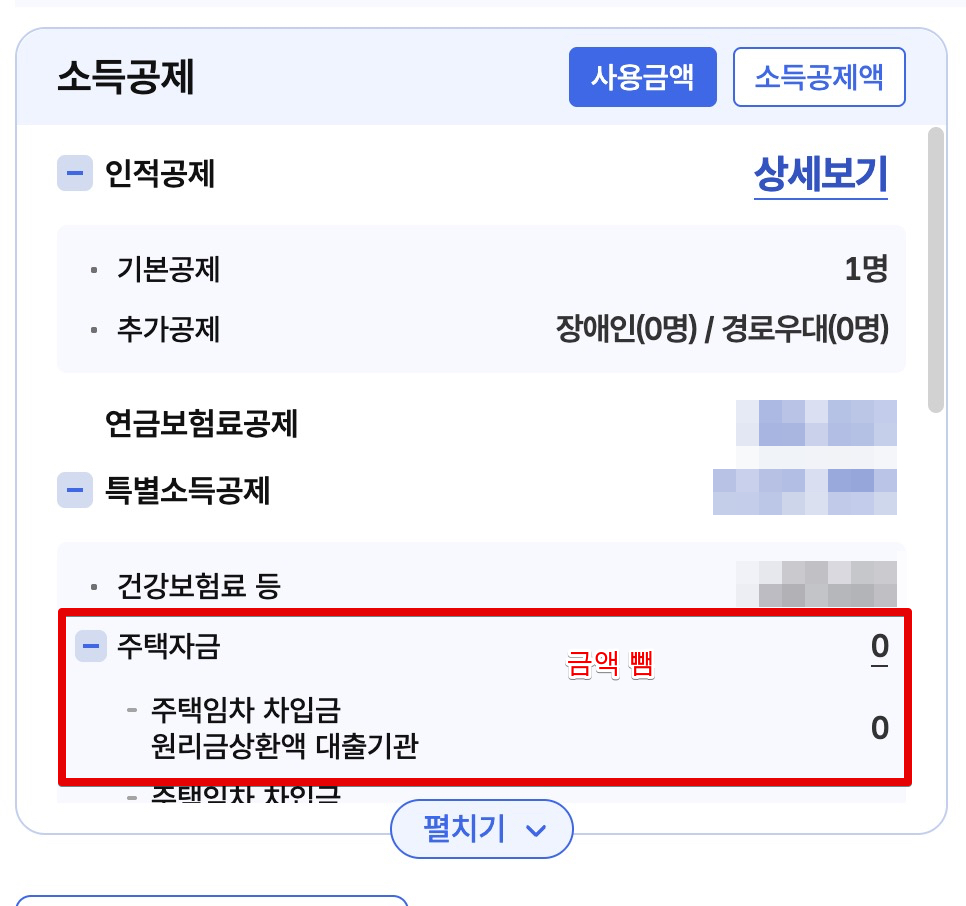 금액이 표시되면 이제 내역을 확인해주면 된다. IRP, 연금저축펀드 등으로 세액공제 투자하는분들의 경우 여기에서 `개인연금저축/연금계좌`항목에 금액이 제대로 들어가있는지 반드시 확인해주어야한다. 고향사랑기부제로 기부를 해서 세액공제 받을 분들은 `기부금`항목 꼭 체크하고, 사업자분들의 경우 노란우산 공제에 돈을 넣고 있다면 `소기업-소상공인 공제부금` 금액이 맞는지 반드시 체크해야한다.
