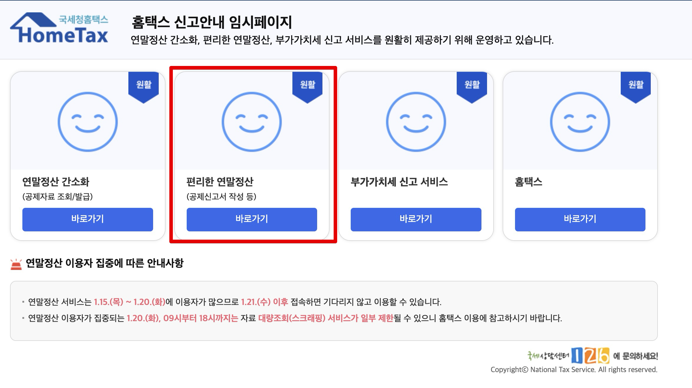 국세청 홈택스 연말정산 페이지에서 두번째에 있는 `편리한 연말정산(공제신고서 작성 등)`을 클릭해도 되고