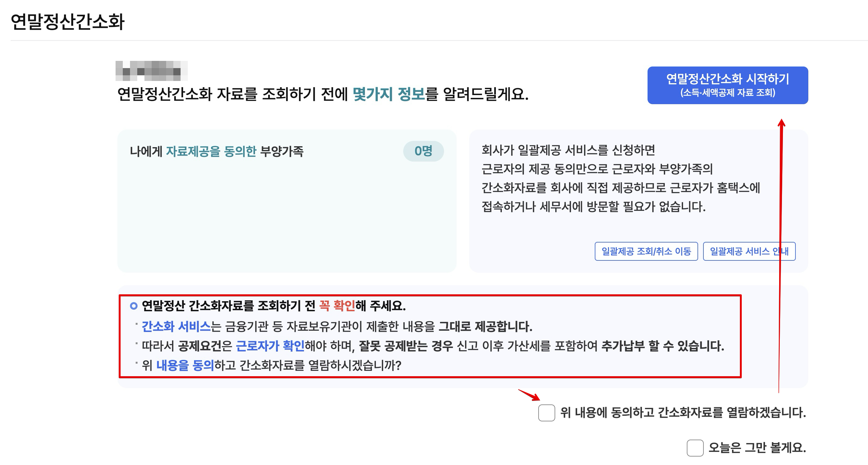 연말정산 간소화 페이지가 나오면 아래 내용을 꼭 읽어봐야한다. 금융기관과 자로뵤유기관이 제출한 내용 그대로 제공하기 때문에 별도로 수정할 부분이 있으면 꼭 수정해주어야한다. 잘못 공제받을 경우 가산세 있으므로 주의. 아래쪽에 체크버튼 동의하고 위에 있는 `연말정산간소화 시작하기(소득 세액공제 자료 조회)`를 클릭한다.