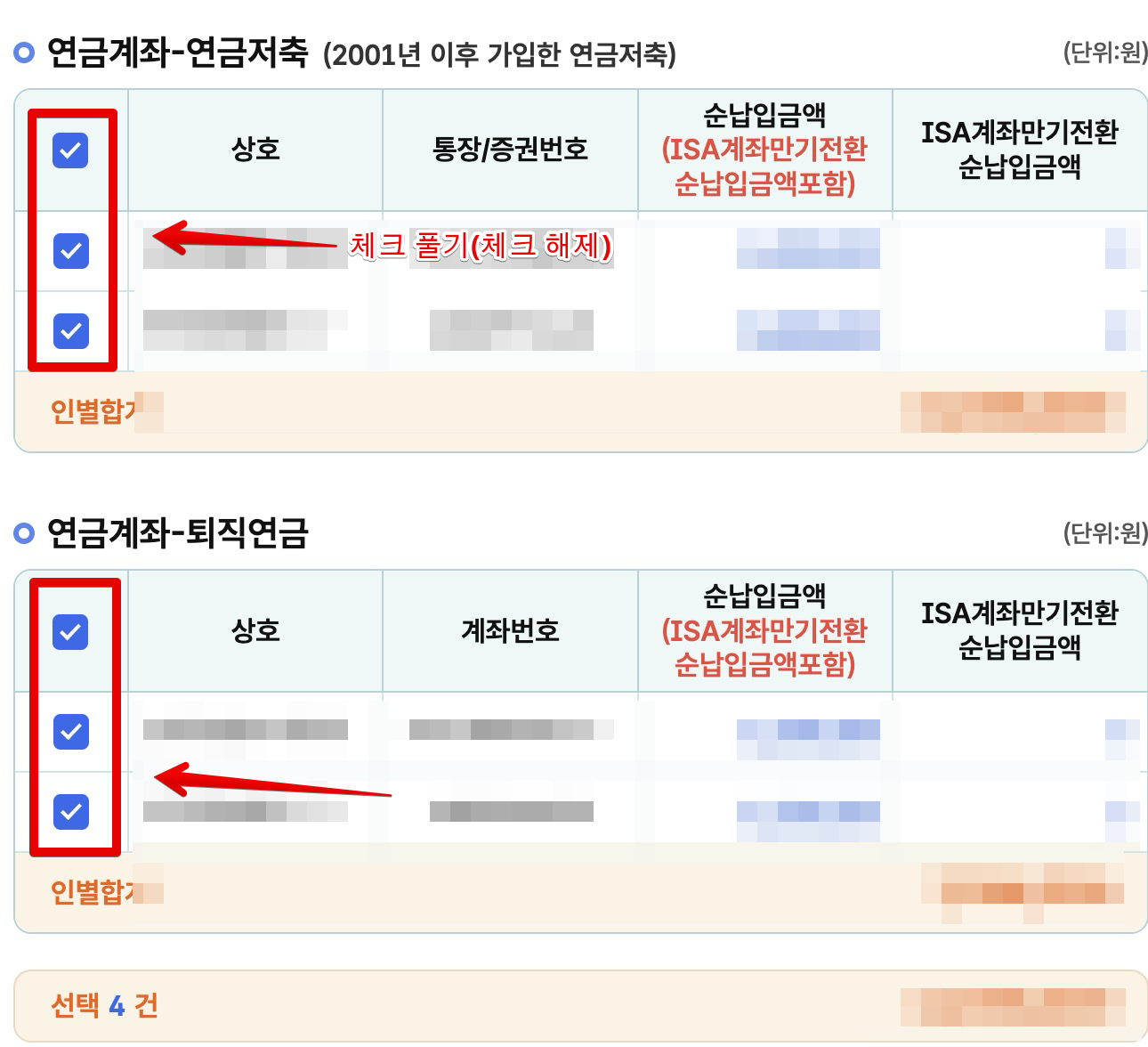 파란색으로 표시된 금액을 직접 클릭해보면 위 이미지처럼 체크된 항목들이 있는데 이걸 체크할 수도 있고 체크를 해제해서 체크를 풀 수도 있다. 체크가 되어있다면 공제 받기이고 체크를 풀어서 해제하게되면 공제 안받기가 된다. 결정세액이 0원이라면, 연금계좌 등에 대한 세액공제는 반드시 체크를 풀고 하는게 유리하니 꼭 기억하자.