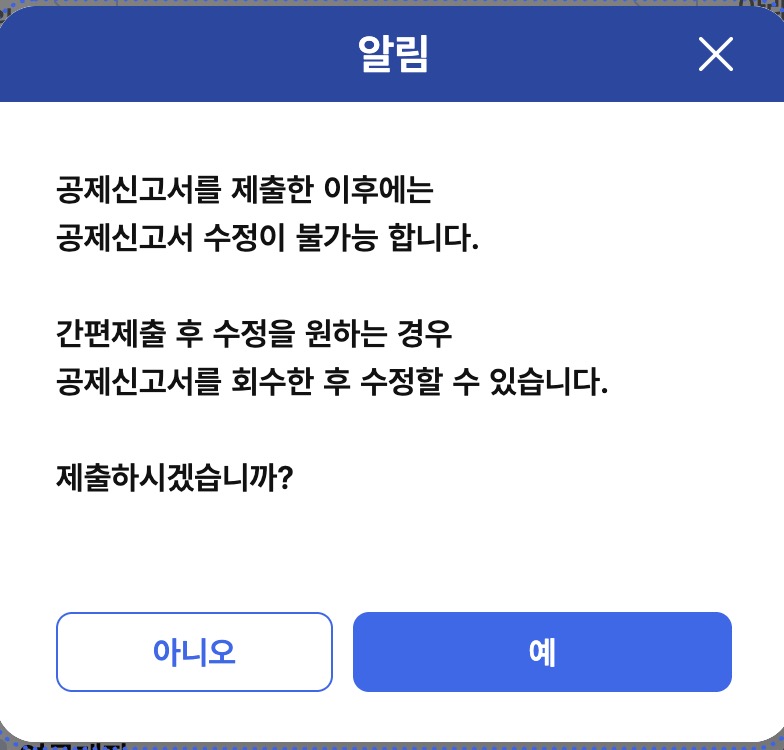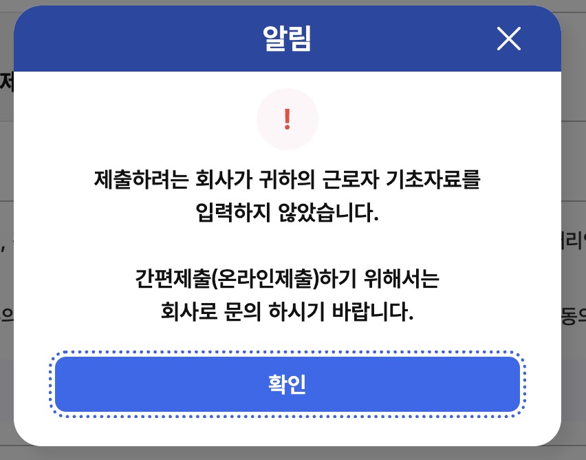 `회사에 제출하기` 버튼의 경우 내가 일하는 회사에 국세청 홈택스에 자료 등록이 되어 있는 곳일 때만 가능하다. 그렇지 않을 경우 위 그림처럼 제출하기 화면이 나와도 마지막에 제출이 되지 않으므로 의미없다.