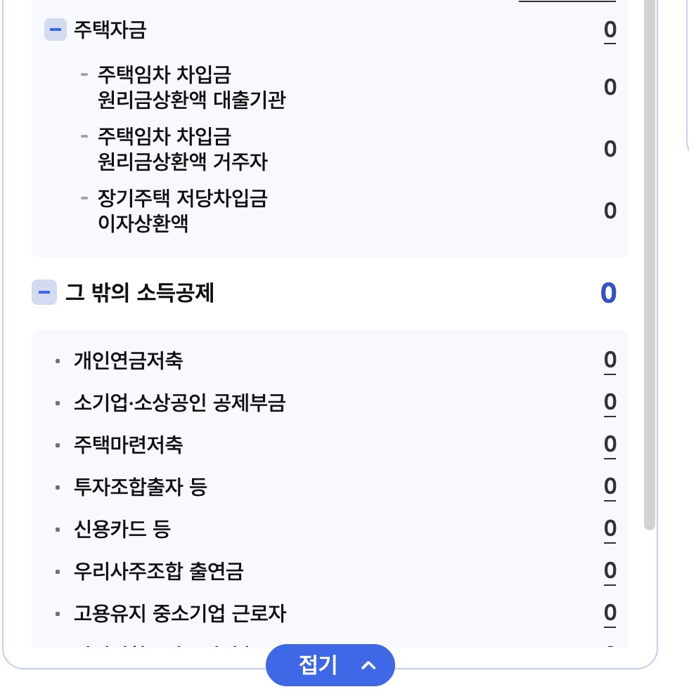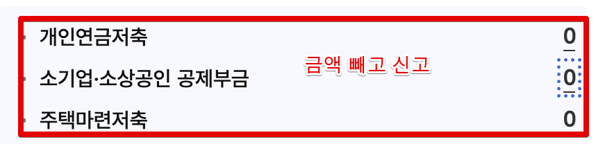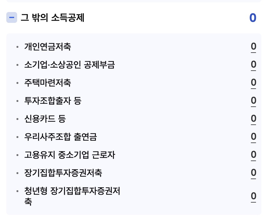 금액이 표시되면 이제 내역을 확인해주면 된다. IRP, 연금저축펀드 등으로 세액공제 투자하는분들의 경우 여기에서 `개인연금저축/연금계좌`항목에 금액이 제대로 들어가있는지 반드시 확인해주어야한다. 고향사랑기부제로 기부를 해서 세액공제 받을 분들은 `기부금`항목 꼭 체크하고, 사업자분들의 경우 노란우산 공제에 돈을 넣고 있다면 `소기업-소상공인 공제부금` 금액이 맞는지 반드시 체크해야한다.
