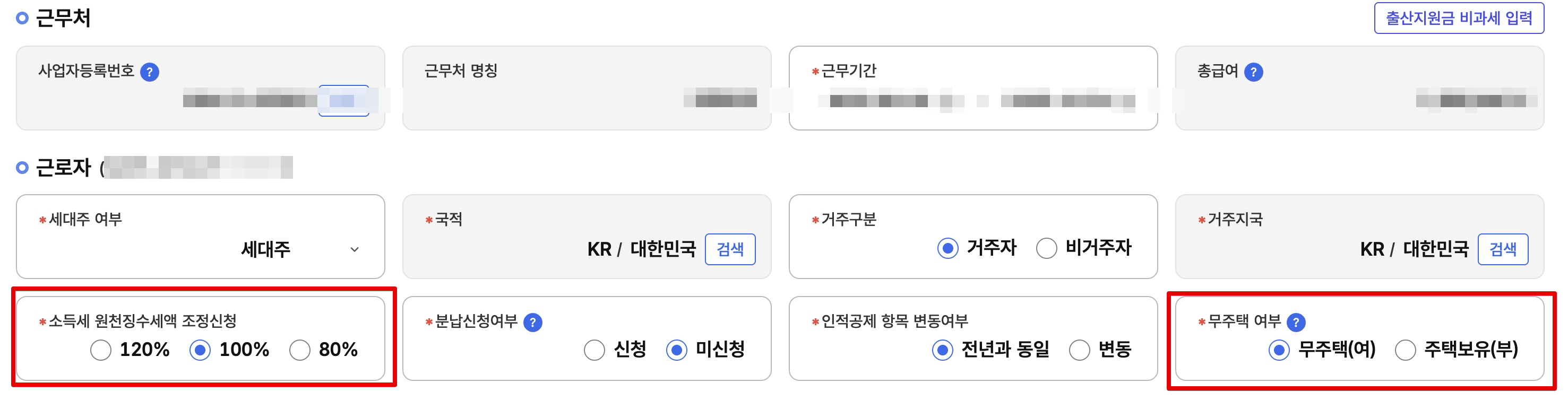 계속 진행하다보면 근로자 항목을 설정하는쪽이 있는데 여기에서 중요하게 봐야할건 두 군데다. 첫번째는 `소득세 원천징수세액 조정신청` 비율을 조정하는 것이다. 만약 조정이 가능하다면 돈을 미리 받을 때 더 많이 받고 나중에 토해내더라도 원천징수 비율을 80%로 설정하는게 추천되긴 한다. 그런데 월급여가 높지 않은 고소득자가 아닌 그냥 평범한 직장인이라면 사실상 큰 차이가 있는건 아니라서 귀찮으면 그냥 100%로 해도 무방하다. 120%는 미리 많이 내고, 나중에 되돌려받을 때 하는건데 이건 비추천이다.