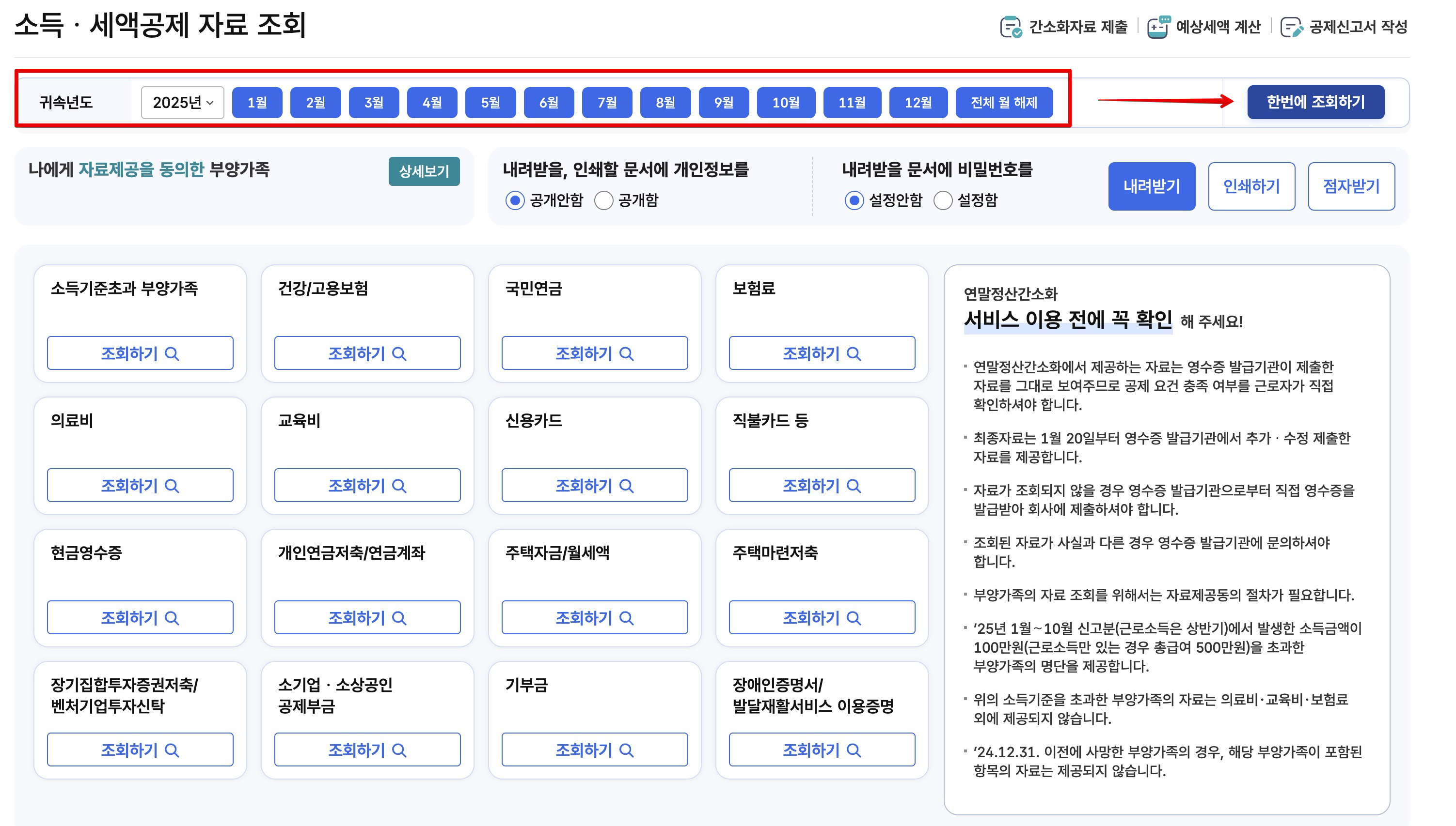 `소득 세액공제 자료 조회`화면이 나오면 귀속년도가 `2025년`으로 설정되어 있는지 확인한다. 다음으로 모든 월이 체크되어 있는지 확인하고 오른쪽 끝에 있는 `한번에 조회하기`를 클릭한다.