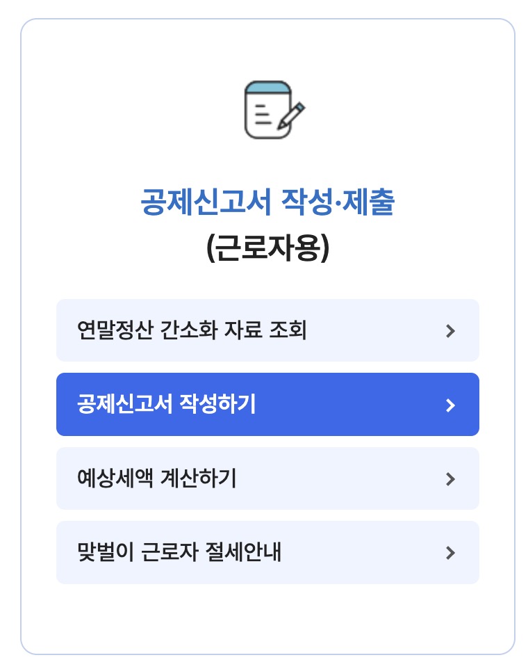 국세청 홈택스 연말정산 페이지에서 두번째에 있는 `편리한 연말정산(공제신고서 작성 등)`을 클릭해도 되고