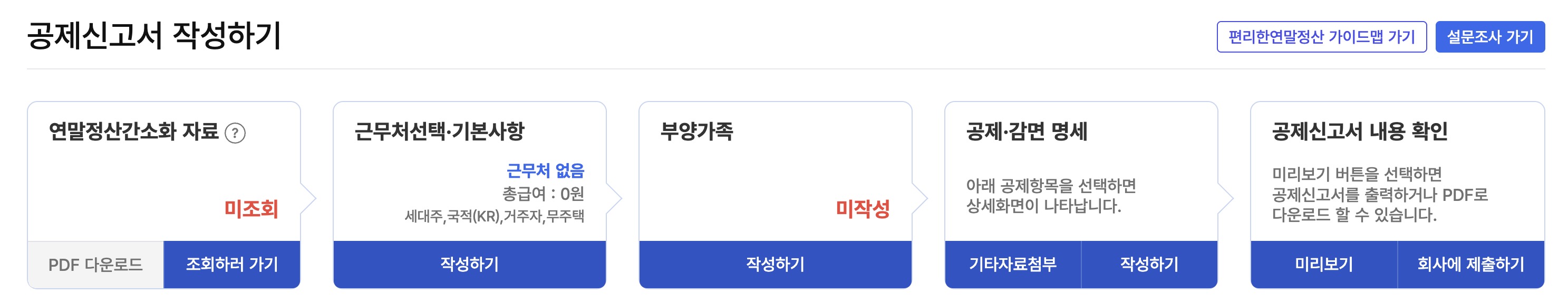 연말정산 간소화 자료 확인 후 다음으로 공제신고서 작성 단계로 들어간다. 첫 페이지부터 다시 해야한다...