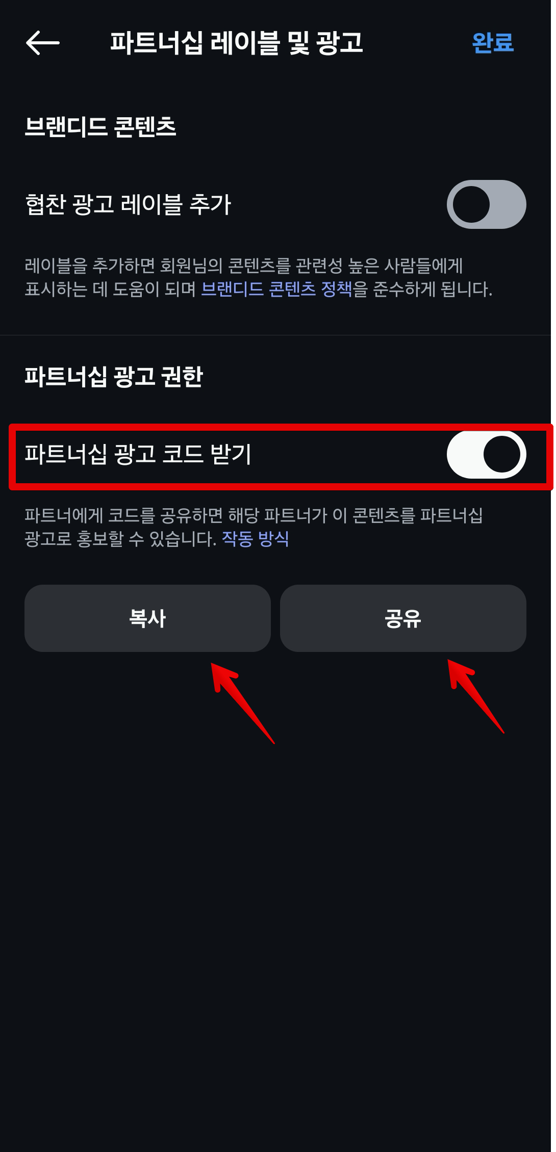 `파트너십 레이블 및 광고` 메뉴를 클릭한다. 처음에 접속하면 이 메뉴가 없을 수 있다. 만약 이 메뉴가 보이지 않는다면 다시 스크롤을 위로 올려서 `브랜디드 콘텐츠`가 사용 가능으로 표시되어 있는지 체크해보자. 다음으로 아래쪽에서 `파트너십 광고 코드 받기`를 활성화해주고 아래쪽에 `복사` 또는 `공유`를 클릭하면 된다.