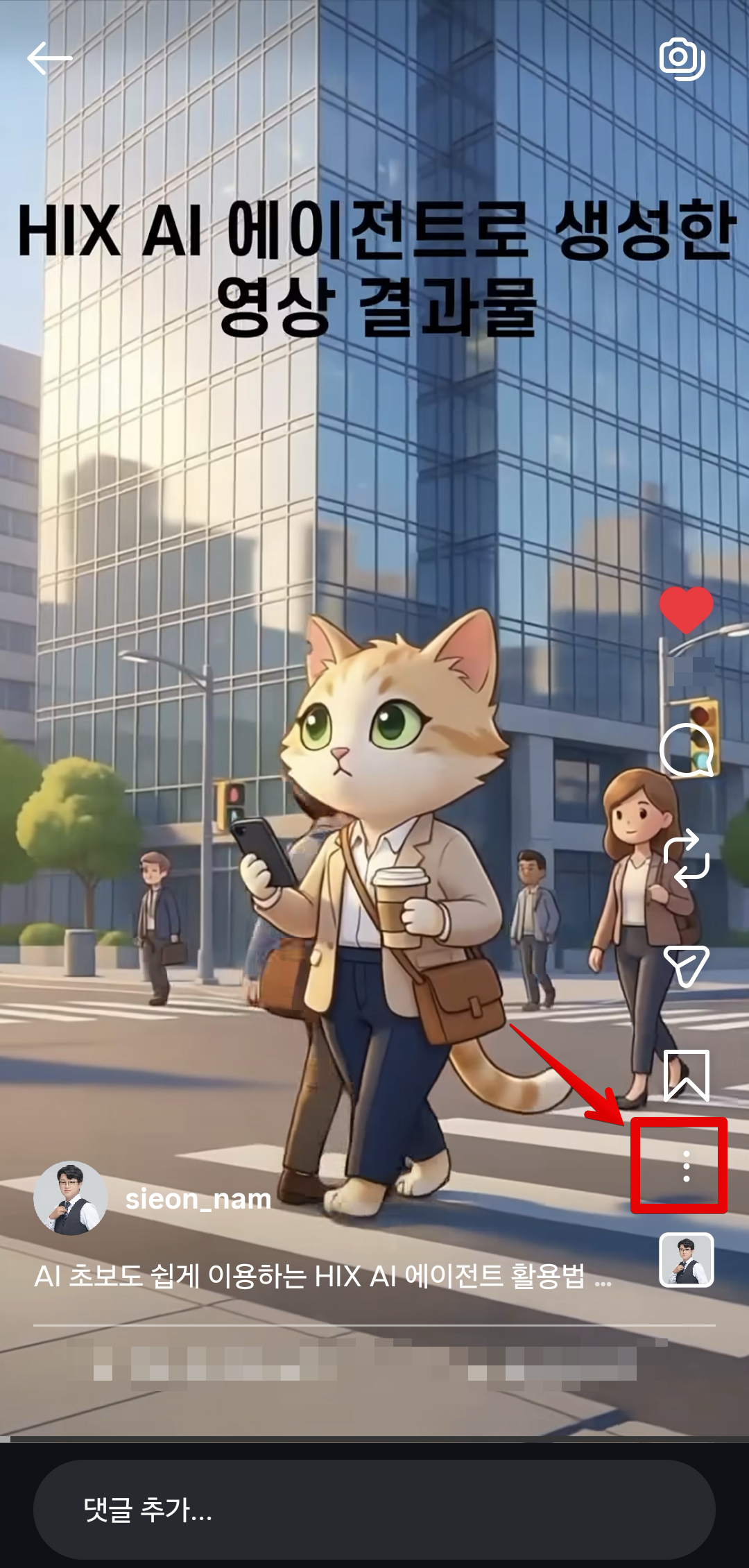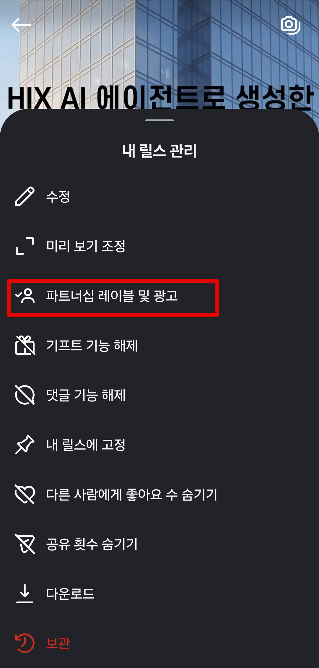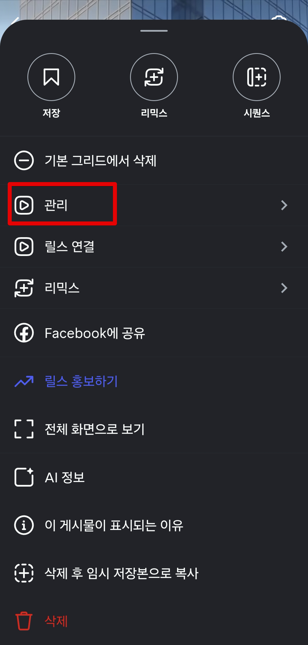 광고 코드를 공유할 인스타그램 릴스 오른쪽 하단에 있는 `점 3개` 버튼을 클릭하고 `관리`로 들어간다.
