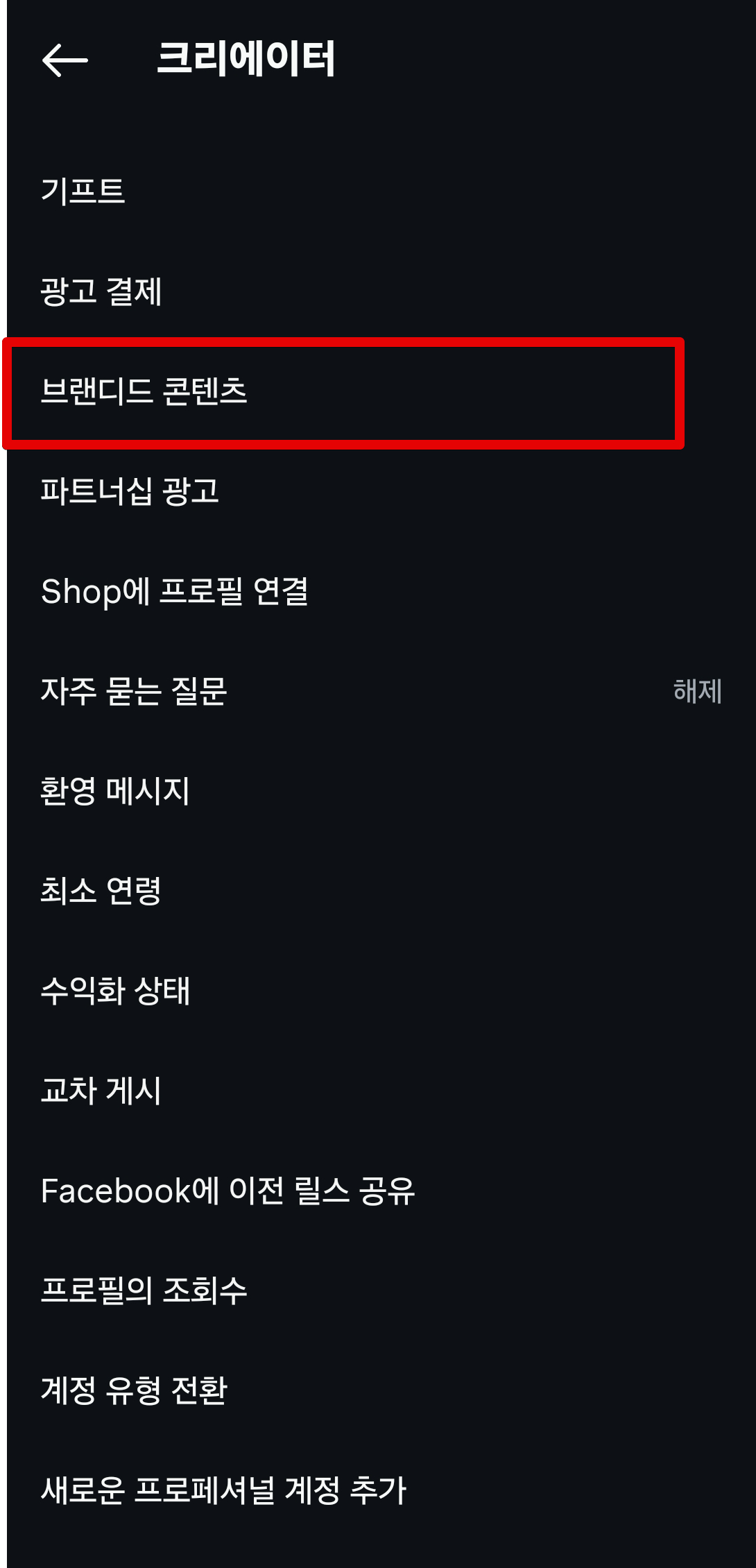 여기에서 `크리에이터 도구 및 관리 옵션`으로 들어가주고 `브랜디드 콘텐츠`를 클릭해서 들어간다.