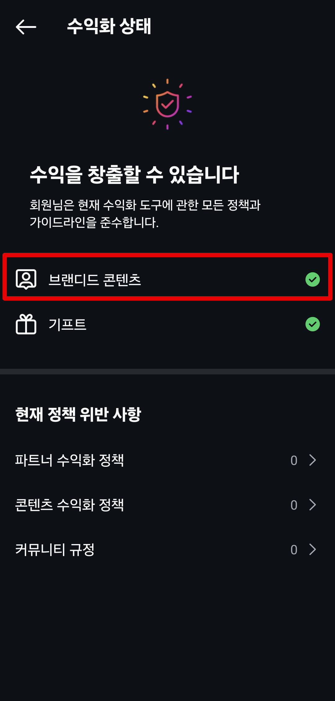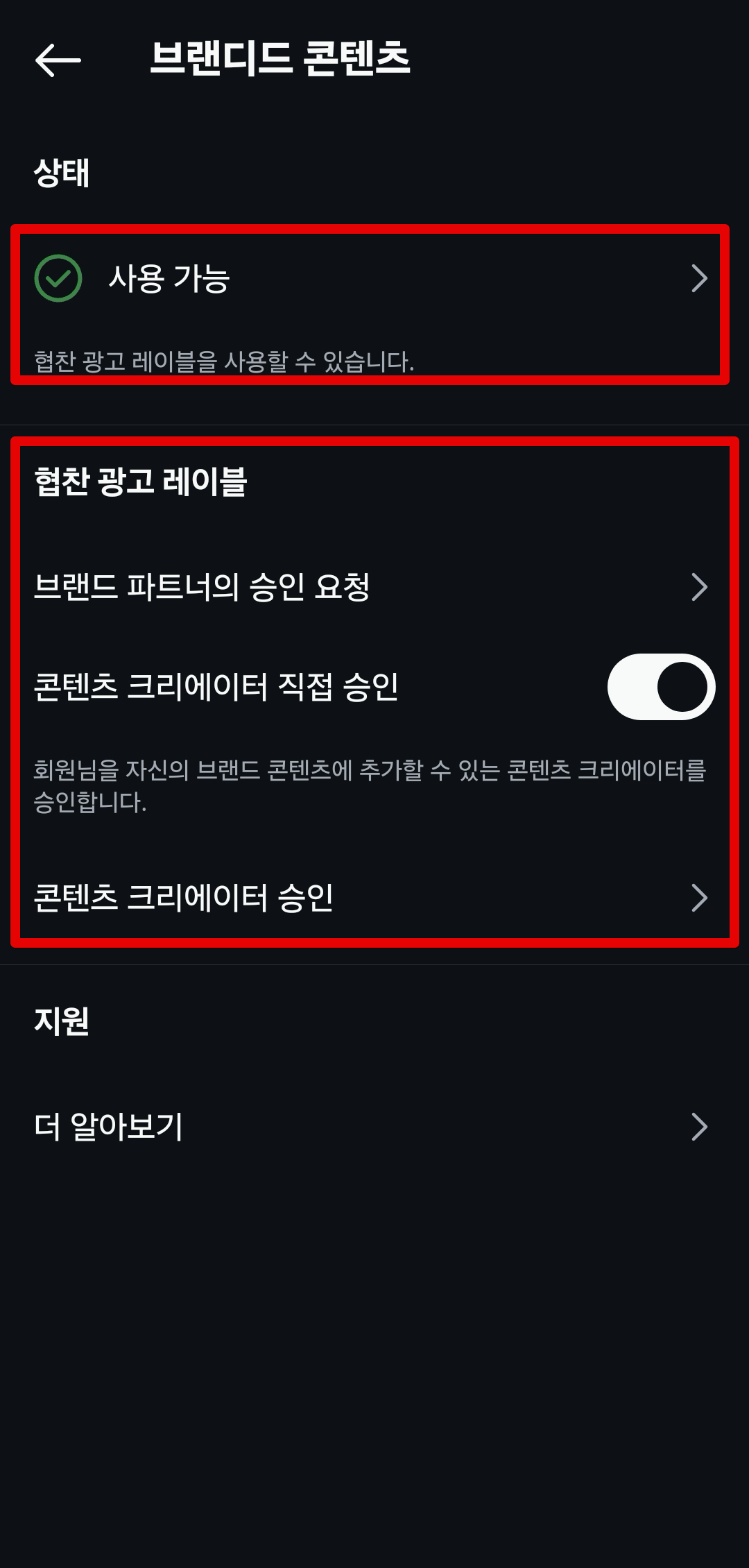 여기에서 `상태`에서 반드시 `사용 가능`이 표시되어야하며 아래쪽에 `협찬 광고 레이블`에서 설정을 할 수 있다. 이후 `수익화`메뉴에 들어가보면 `브랜디드 콘텐츠`에 체크버튼 초록색이 나와있으면 설정은 끝이다.