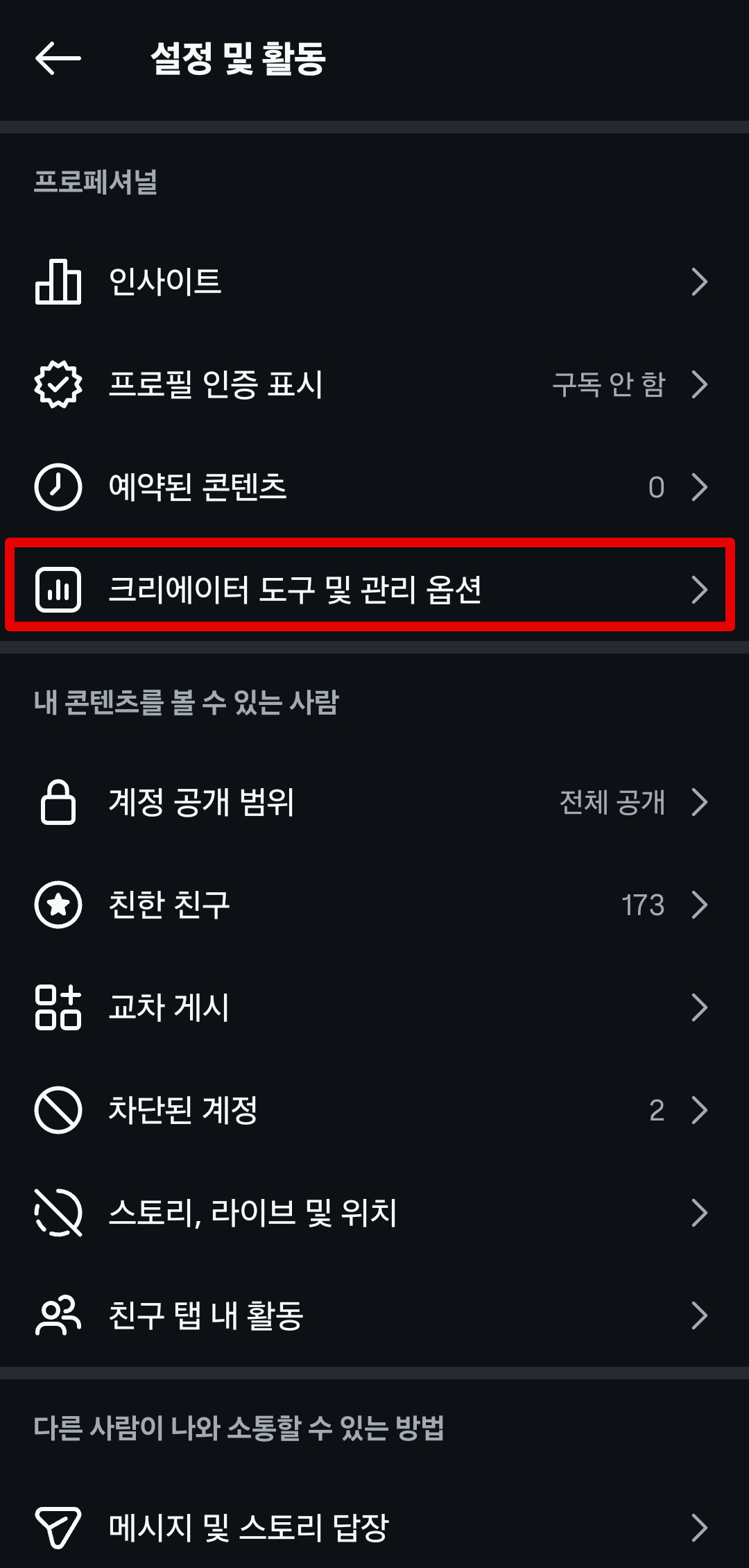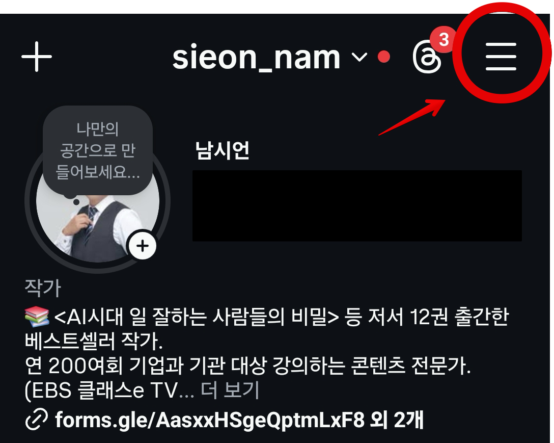 인스타그램 계정에서 우측 상단에 있는 `메뉴`로 들어간다.