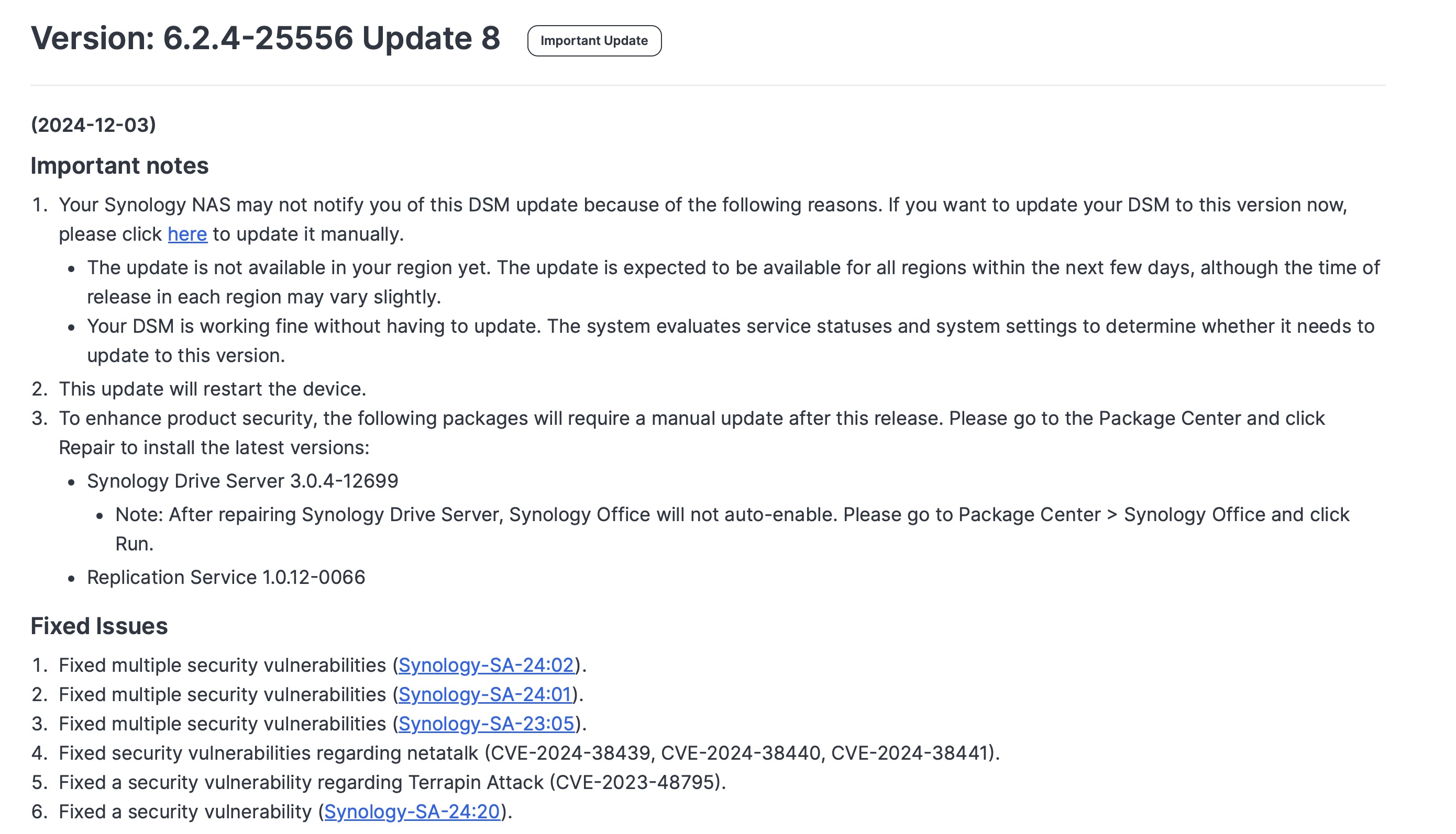잠시 DSM에 접속이 가능해졌을 때 DSM을 둘러보다보니 업데이트가 있었다. (*이때 나는 이 선택을 하면 안되었다) 그래서 급하게 업데이트 다운로드 버튼을 눌러놓고 릴리즈 노트를 읽고있는데 DSM을 업데이트 하는 사이에 또 나스 연결이 끊어져버렸다. 그리고 이때 이후로 부팅이 안된다...