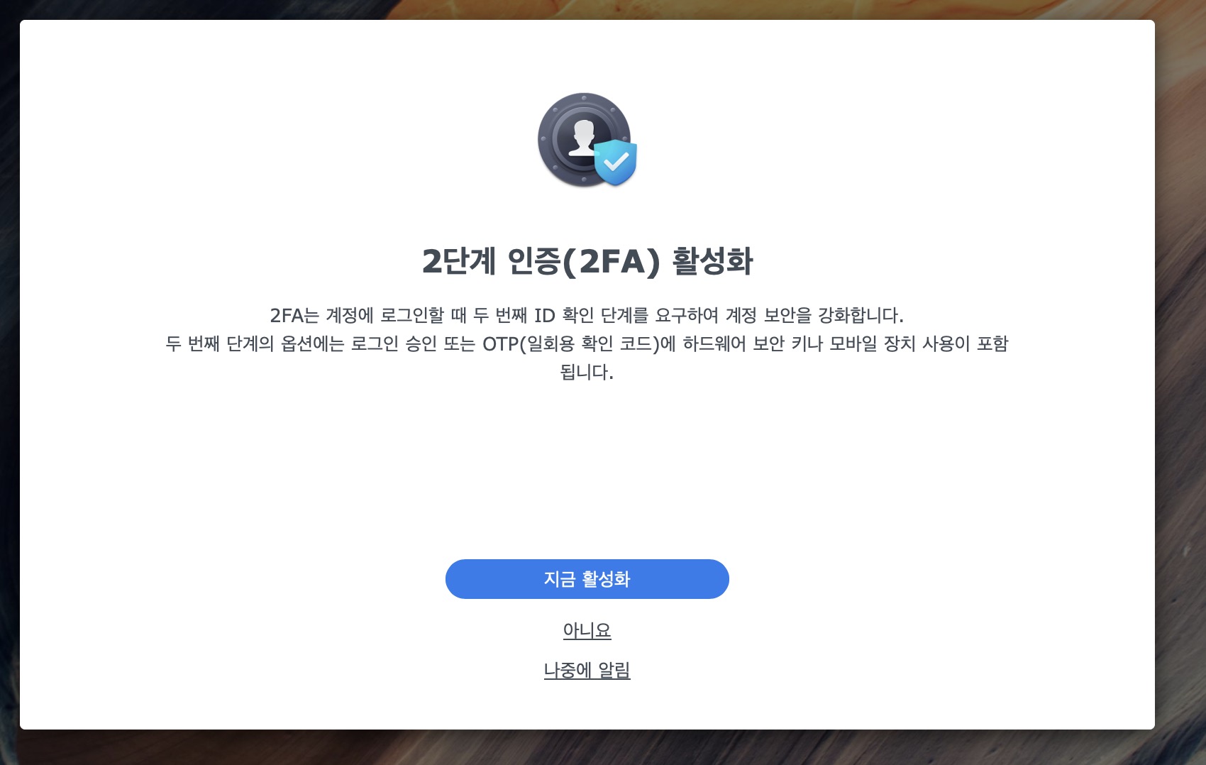 2단계 인증(2FA)도 처음에는 활성화안하고 일단 접속부터 하였고 나중에 맥용 타임머신 하드 꽂을 때 다시 활성화하였다.