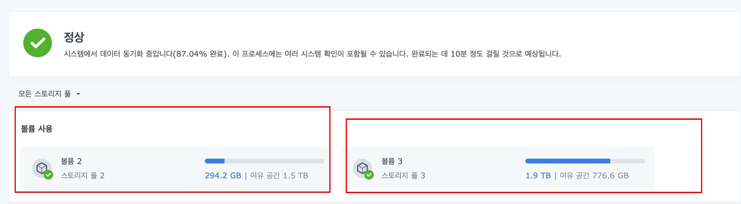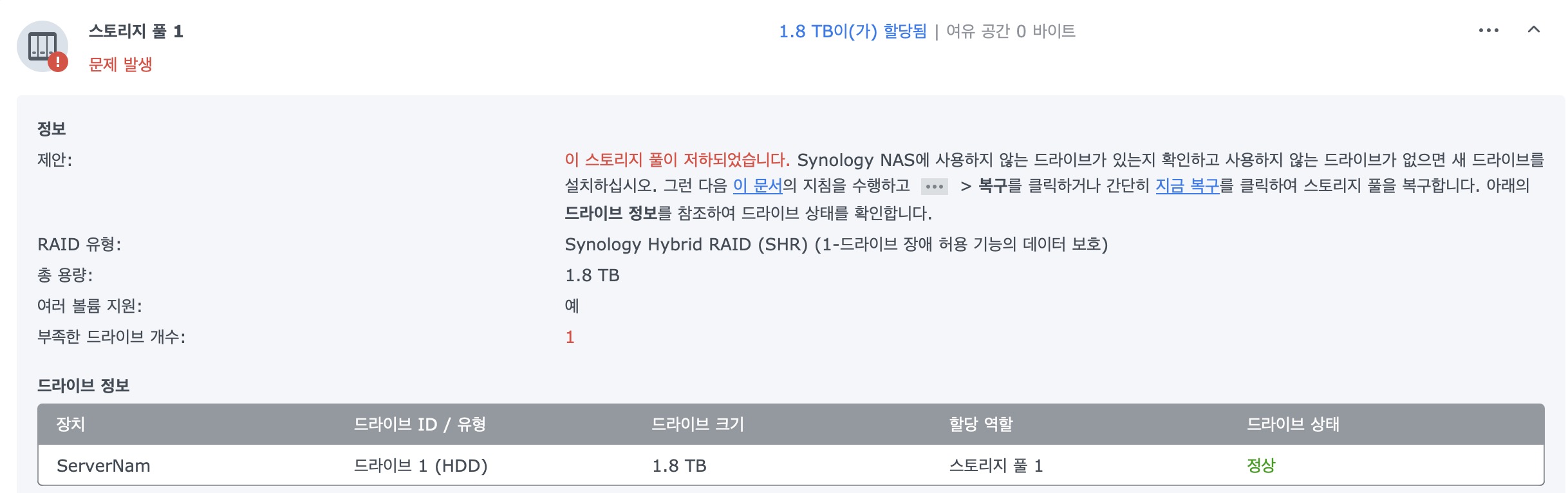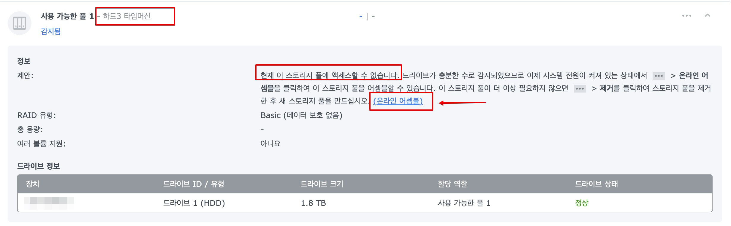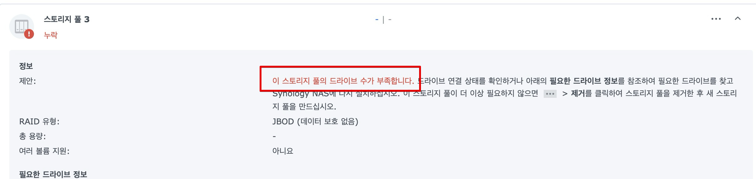 하드 2번(레이드 하드, 이중 백업용 하드였음)은 스토리지 풀의 드라이브 수가 부족하다고 뜨면서 자꾸 경고음만 나온다.