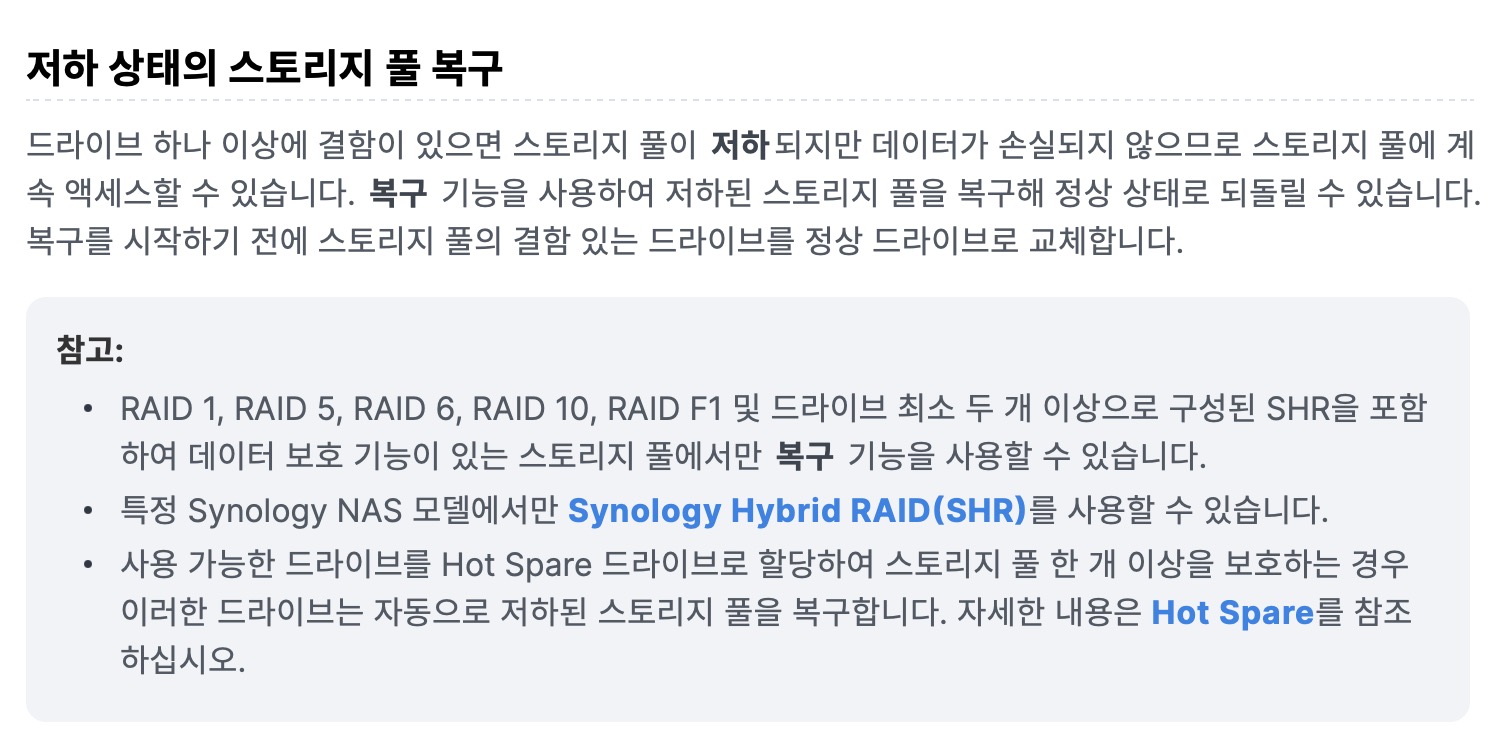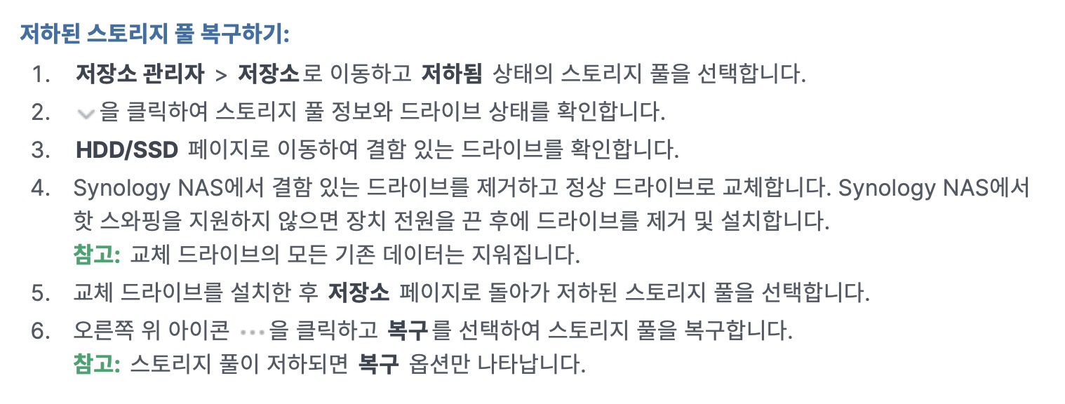 시놀로지 나스 홈페이지에서 저하된 프로지 풀 복구하기라고 하는 안내 설명이 있길래 읽어보았다. 뭔말인지 모르겠다... 그냥 안할란다!