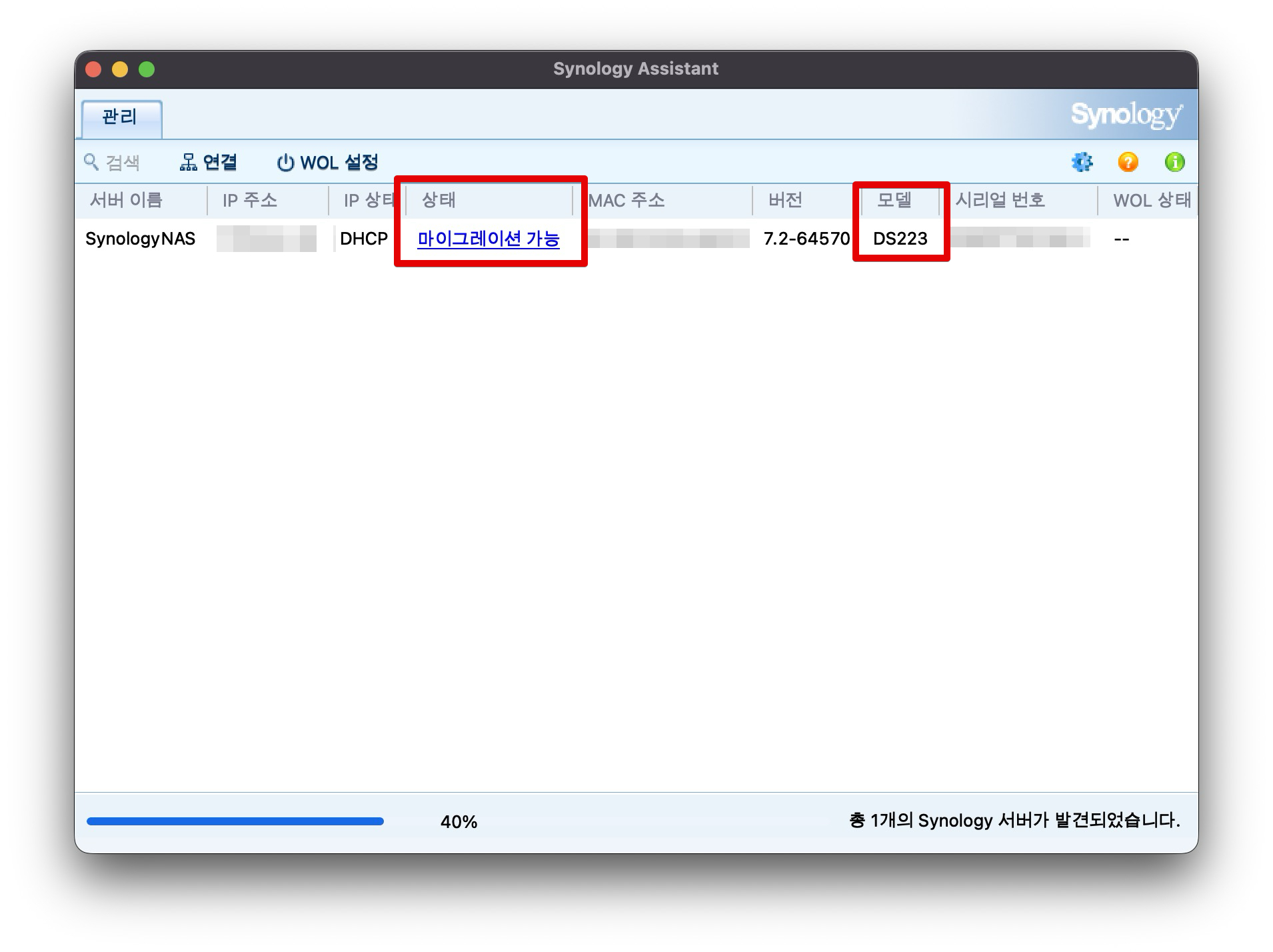 시놀로지 나스 검색해보면 새로운 시놀로지 SD223이 잡히고 상태창에 `마이그레이션 가능`이 뜬다.