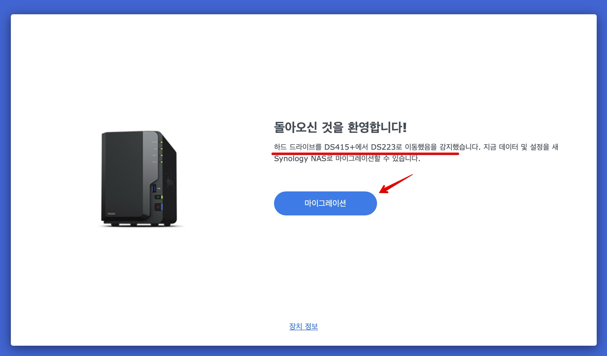 하드 드라이브 DS415+에서 DS223으로 이동 감지. 정확하다. `마이그레이션` 클릭.