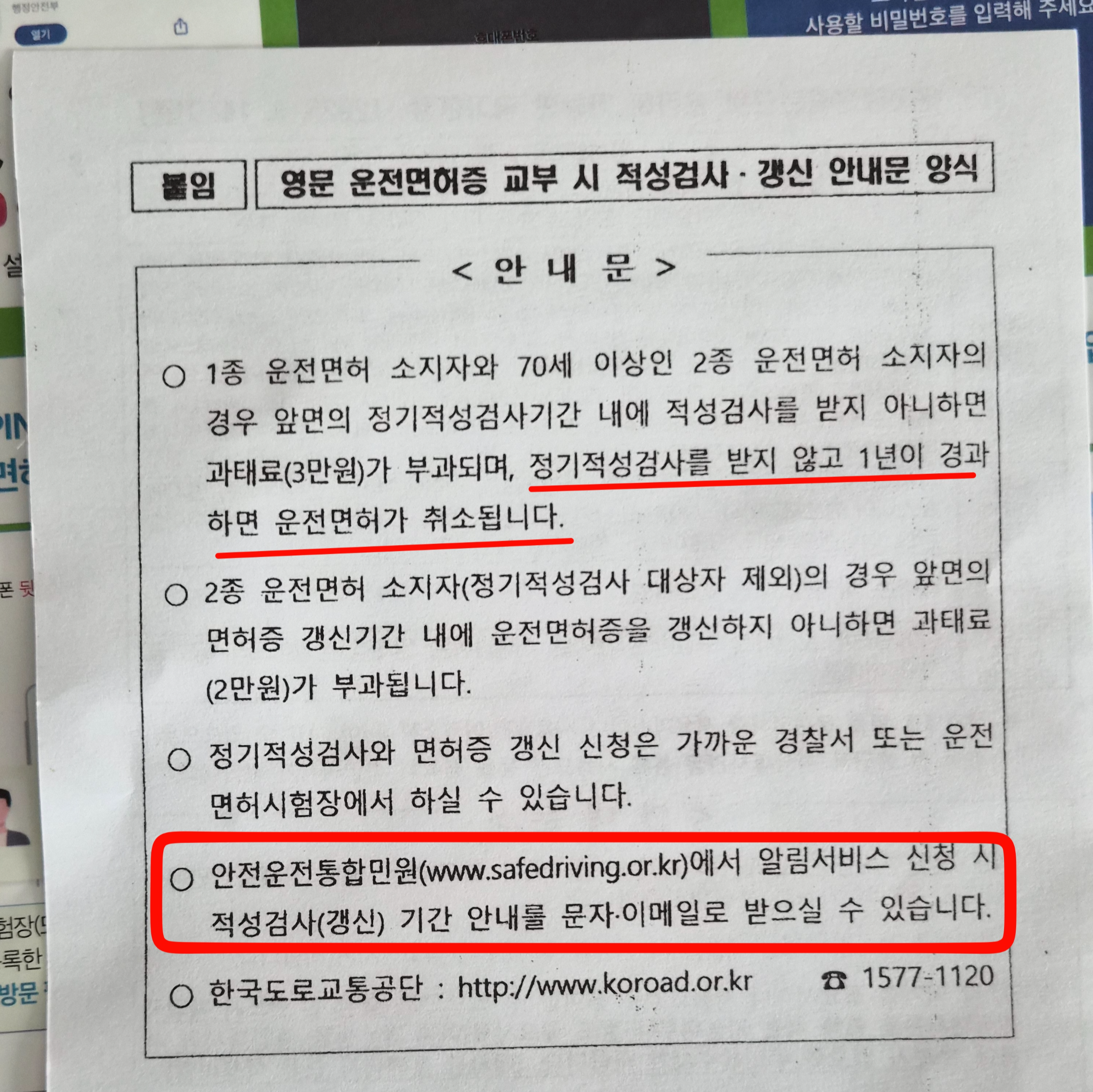 또 다른 안내문에서는 적성검사 안받고 1년 지나면 운전면허 취소된다는 내용과 안전운전통합민원에서 알림서비스를 신청해두면 적성검사와 갱신 때 기간 안내를 문자와 이메일로 받을 수 있다고한다. 이거 안전운전통합민원 알림서비스 신청은 유용해보여서 신청하려고 한다. 근데 홈페이지에서 아무리 메뉴를 찾아봐도 알림서비스 메뉴가 없는데? 어떻게 하는지 모르겠다... 옛날 내용인가...;;;
