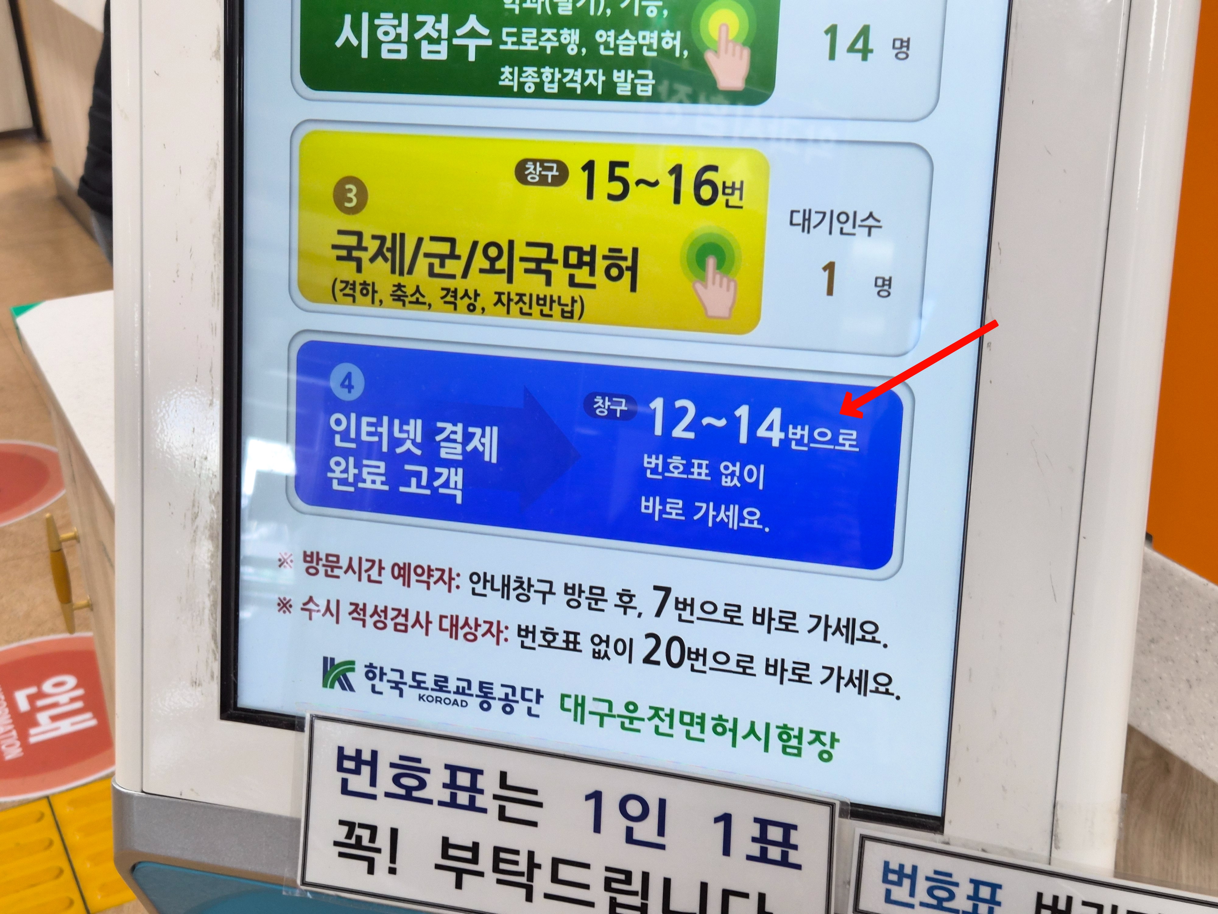 여기는 사람이 엄청나게 많기 때문에 항상 복잡하다. 들어가자마자 입구에 있는 번호표 뽑는 기계에보면 `인터넷 결제 완료 고객`은 12번 창구로 가라고 되어 있어서 12번 창구로 곧바로 가면 된다.