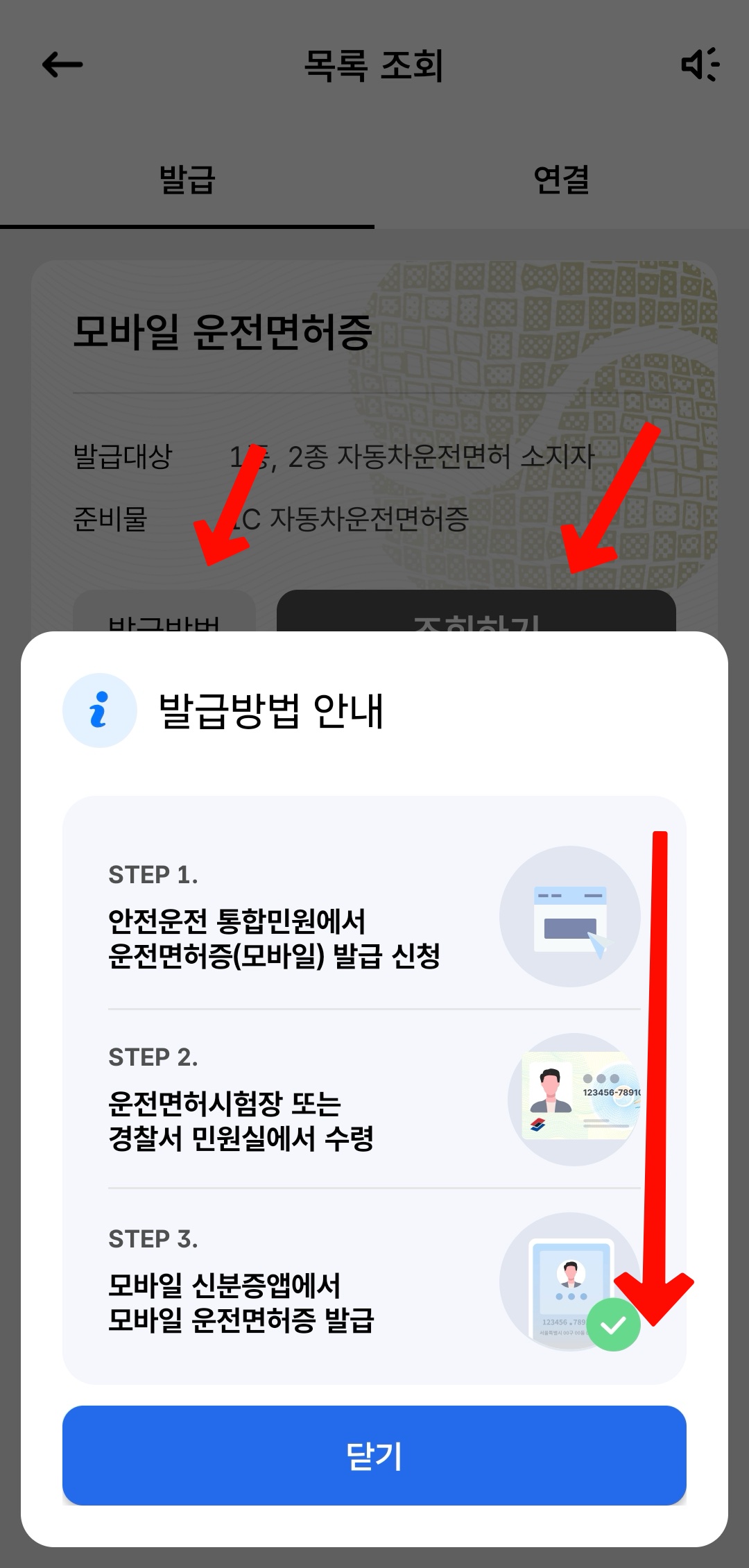 그 다음에 이제 제일 중요한 모바일신분증 앱(나는 행안부 공식 앱만 사용한다. PASS나 삼성페이는 안씀)에서 모바일 운전면허증 발급방법 확인하고 조회하기해서 곧바로 등록해준다. 그리고 앞으로는 이것만 쓰면 되고 운전면허증은 따로 보관한다.