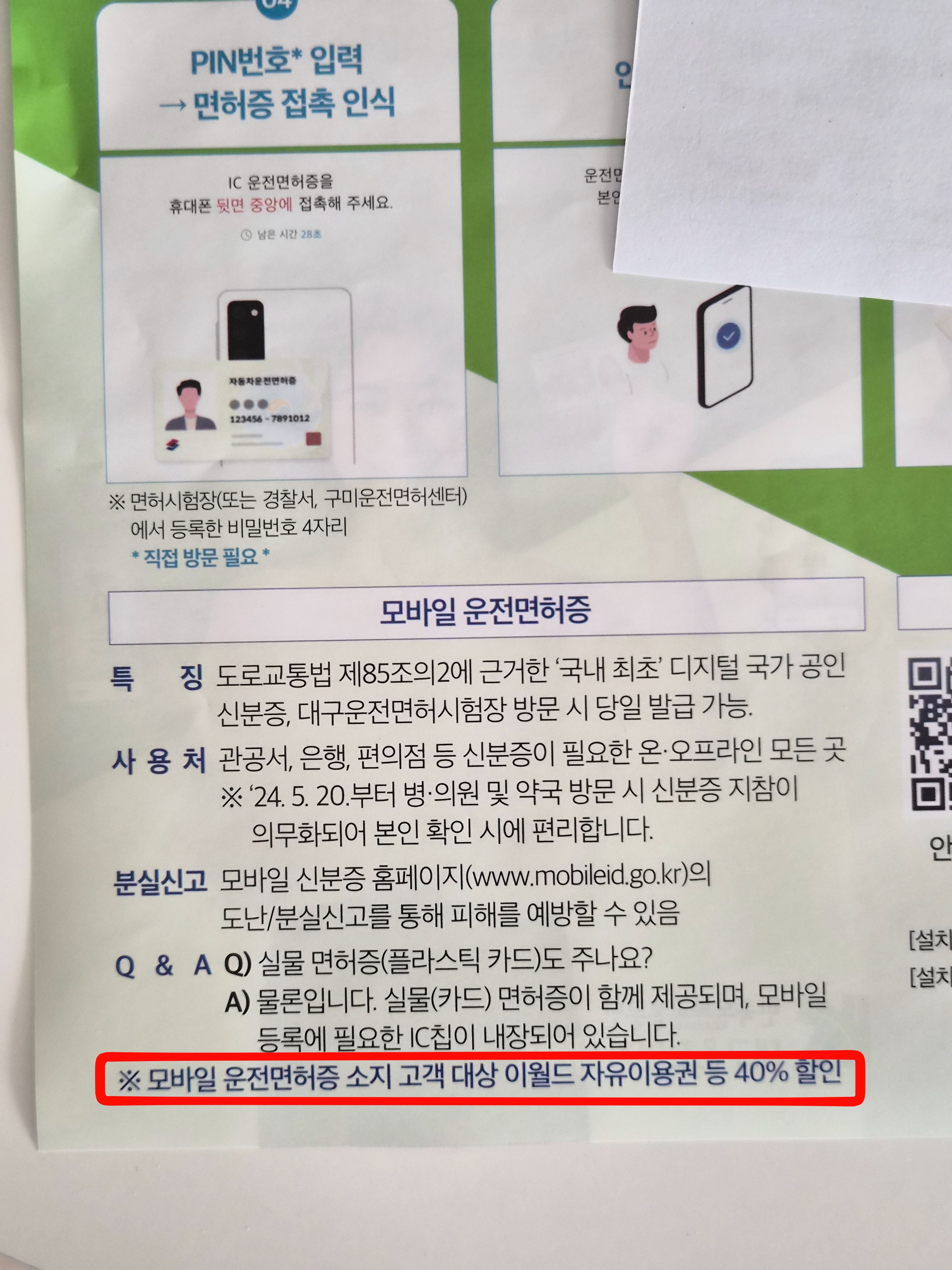 그리고 대구운전면허시험장에서는 면허증과 함께 이런 종이 안내문을 준다. 모바일등록 방법 같은거 나와있는건데 나는 이미 알고 있었어서 넘어가고 아래쪽에 모바일 운전면허 소지 고객은 이월드 자유이용권 40% 할인해준다는것만 눈에 보였다...ㅋㅋ 이런것도 있었나?
