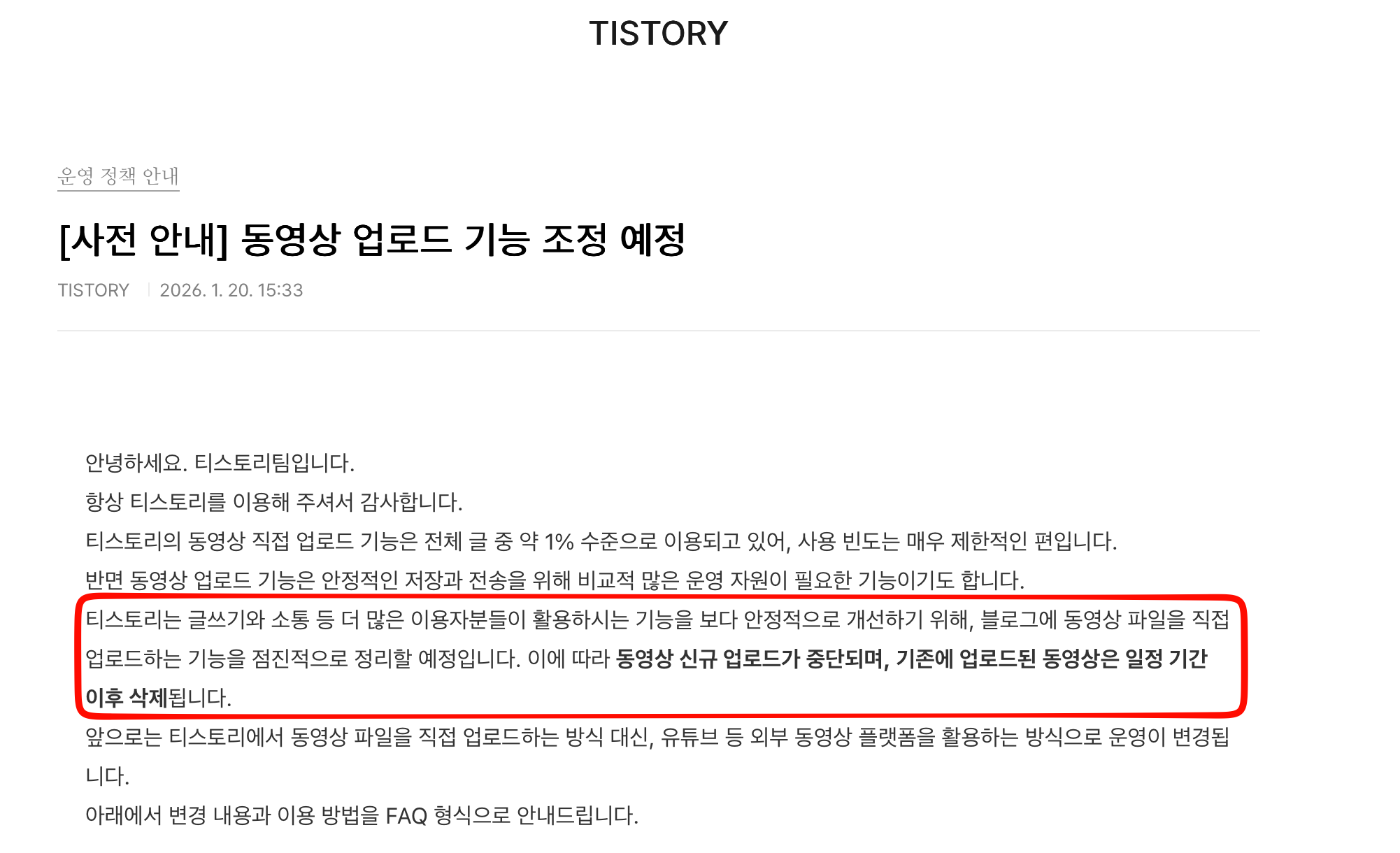 2026년 1월 20일 오후. 기습적으로 티스토리 공식으로 공지가 나왔다. 티스토리 블로그에 동영상 업로드 기능이 있는데 이 기능을 이제 못쓴다는 내용이었고 심지어 기존에 올라갔던 동영상 서비스도 중단한다는 소식이었다.