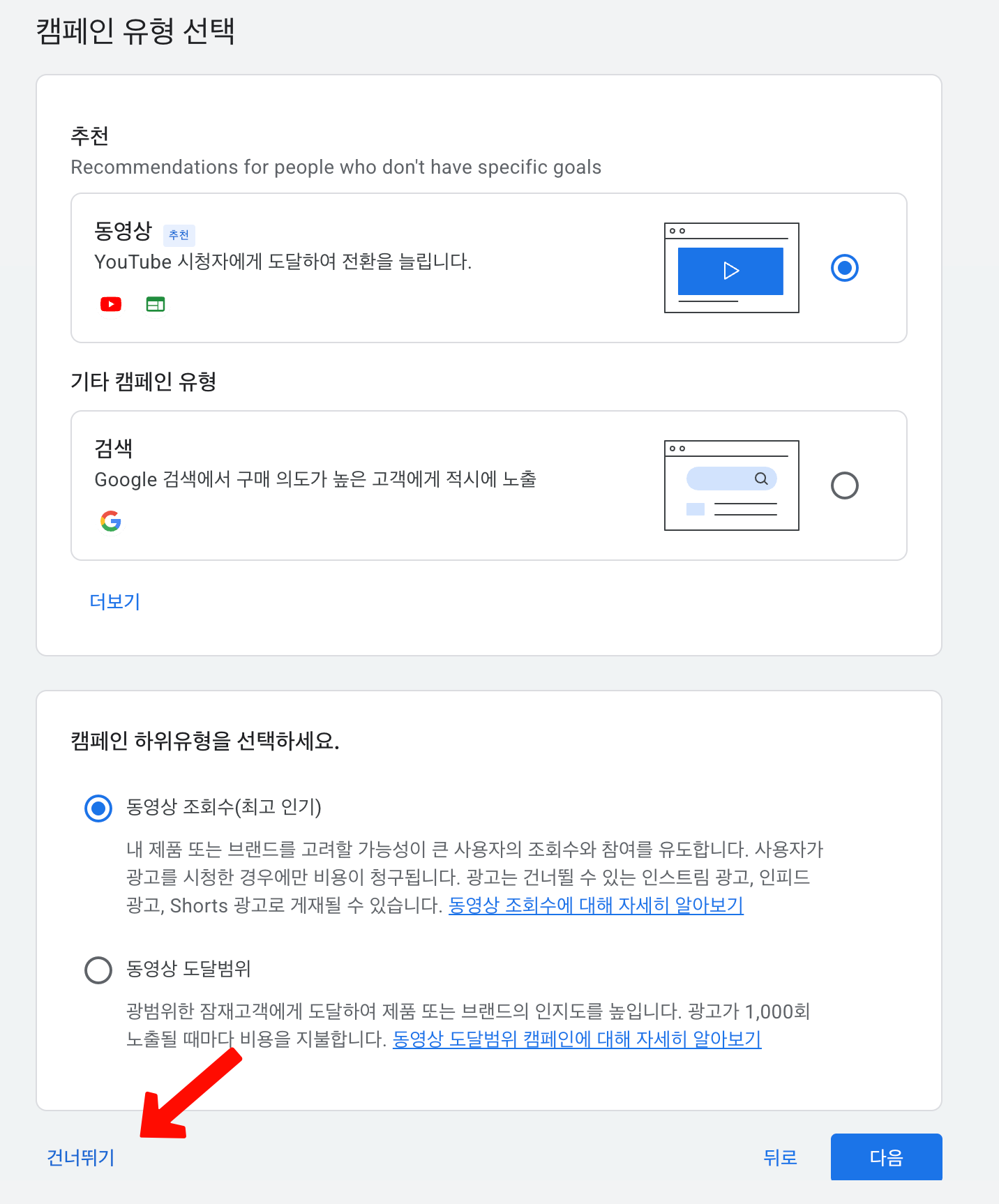 다음으로 캠페인 목표 선택하라는 창 있는데 이것도 그냥 `건너뛰기`눌러서 넘어간다. 알고봤더니 나중에도 다 설정할 수 있었다. 캠페인 유형도 그냥 건너뛰기 해주었다. 기능 많은건 좋은데 설정할게 너무 많고 엄청 복잡하게 느껴졌다. 내용에 압도당하는 기분.