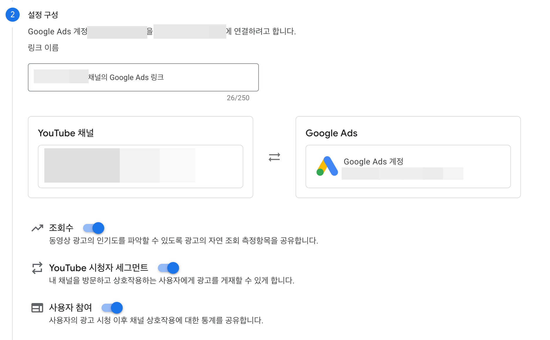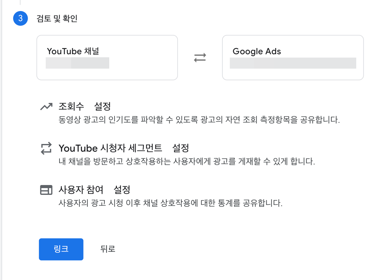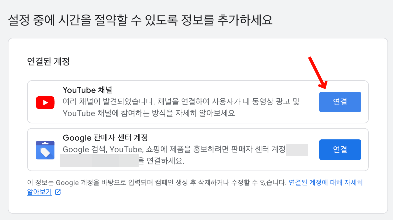 다음으로 유튜브 채널을 연결하는 기능과 구글 판매자 센터 계정을 연결하는 기능이 제공된다. 이런 부분은 좋았다. 나는 유튜브 채널을 연동할 계획이므로 위에 있는 유튜브 채널 연결을 진행해주었다. 이렇게하면 유튜브 스튜디오에서 확인해보면 지금 만들고 있는 구글 애즈 계정이 연결된 모습을 나중에 볼 수 있다.