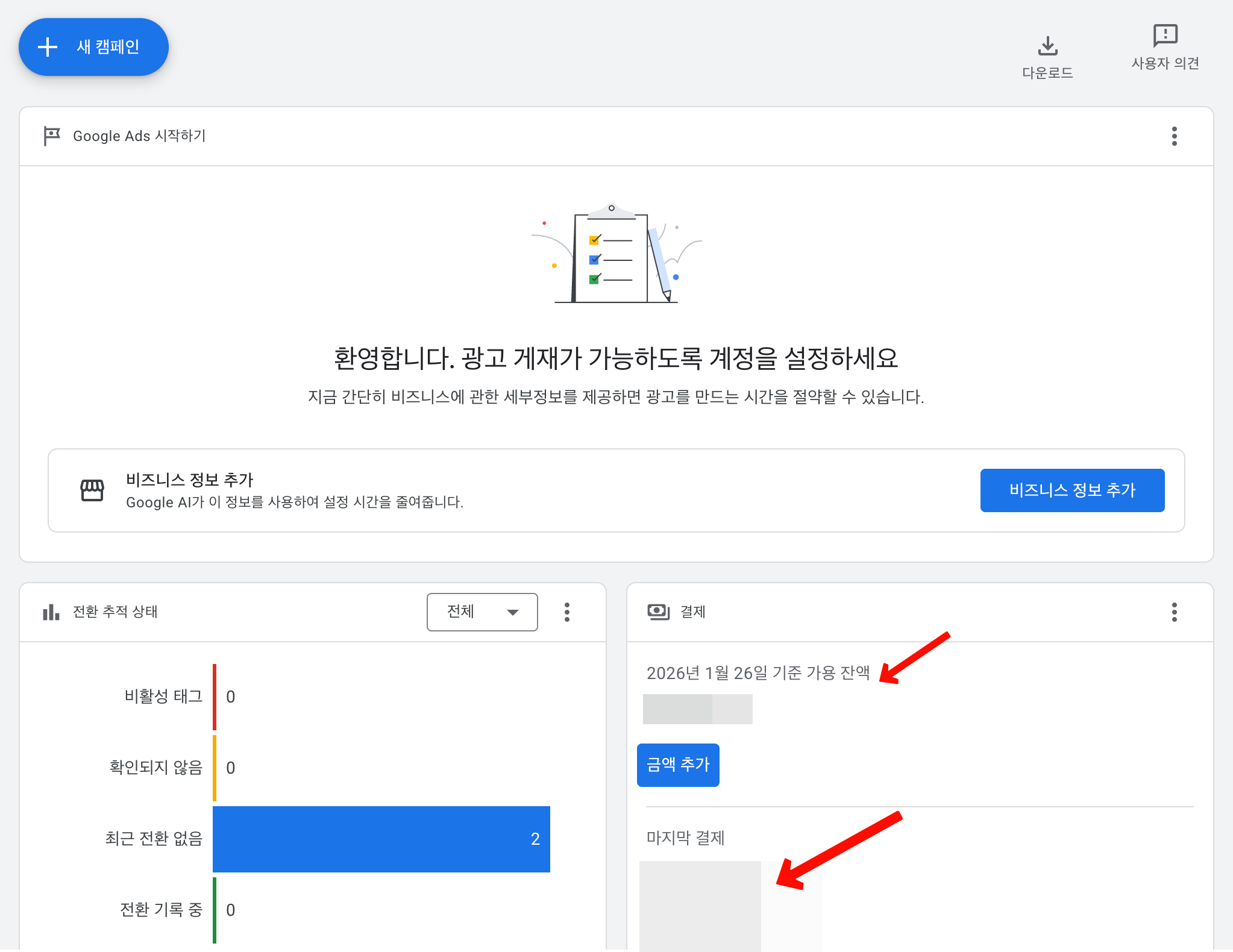 구글 애즈의 경우 처음에 계정을 만들 때부터 곧바로 캠페인을 만들어라고 안내하고 있다. 그리고 이 과정에서 실제 광고비 결제가 필요하기 때문에 잘 생각해서 해야한다.