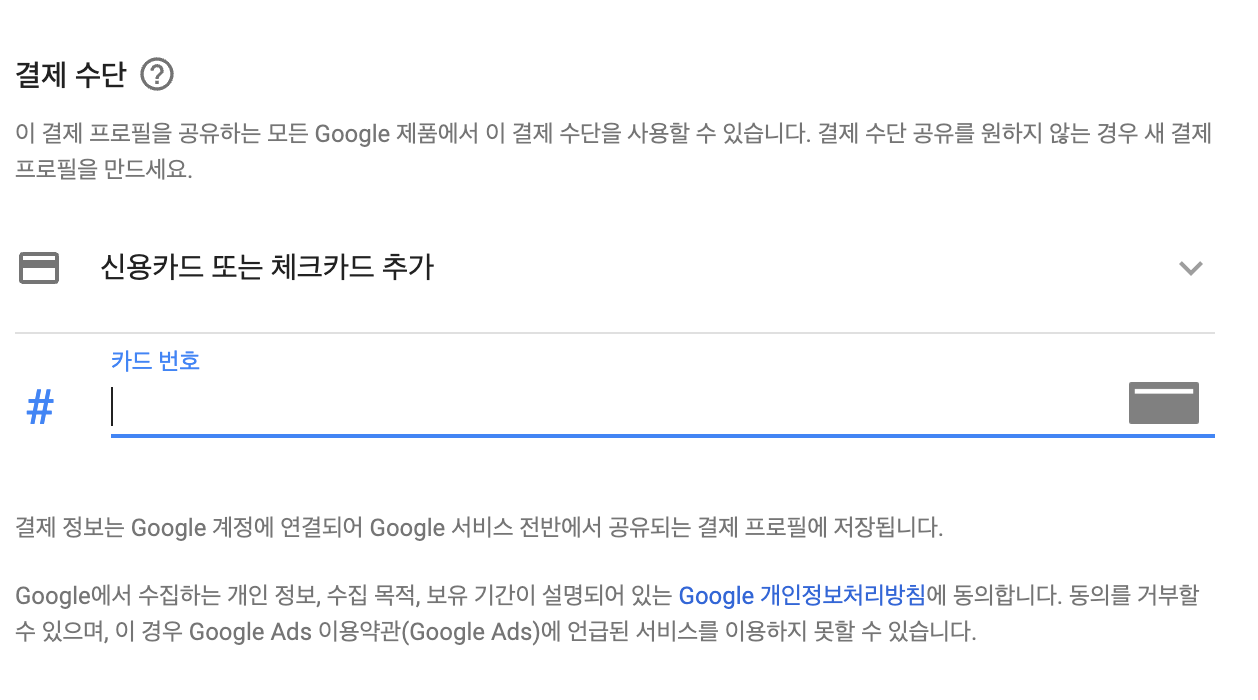 결제 수단을 추가해야한다. 신용카드나 휴대폰 결제 등을 이용할 수 있다. 사업자 명의로 지금 광고 계정을 생성중이므로, 사업자카드를 등록하는게 정석이다. 내가 해보니까 사업자카드 자체에 비자나 마스터카드 기능이 없어도 결제가 가능했다. 어차피 구글 한국 법인 사업자번호로 결제된다.