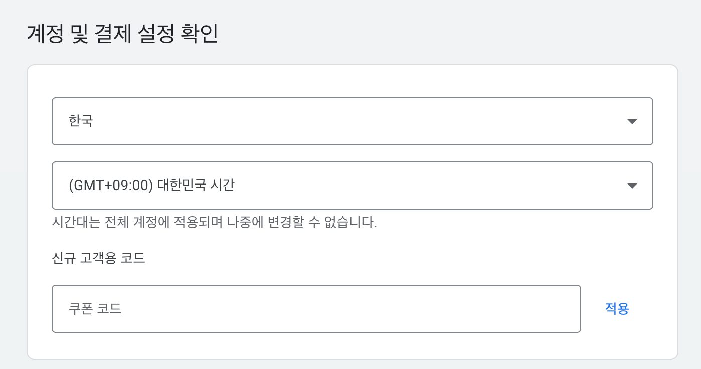 여기까지하게되면, 결제가 곧바로 되면서 계정이 생성된다. 결제하면서 계정 만드는건 구글 애즈에서 난생 처음 겪어봤다.ㅋㅋㅋ 이거 진행하는 과정에서 어떻게 어떻게 잘 알아보면 결제 없이도 계정을 만들 수 있을것 같기도 한데 방법은 잘 모르겠다. 괜히 시도했다가 계정에 문제생길까봐 그냥 나오는 순서대로 따라하며 진행했다.