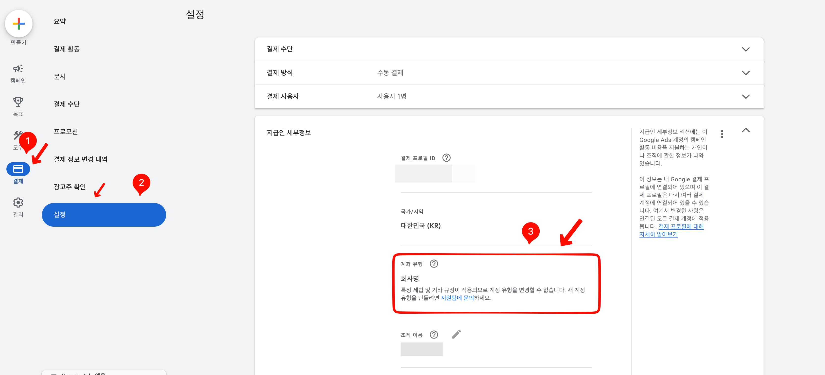 이제 새로 만들어진 계정에서 사업자로 되어 있는지 최종 체크를 해보았다. `결제`메뉴에서 `설정`으로 들어간 다음 `지급인 세부정보`를 클릭하고 `계좌 유형`이 `회사명`으로 되어있는지 보면된다.