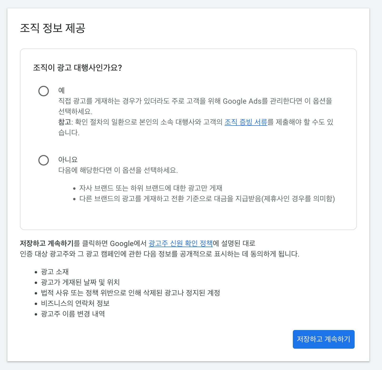 광고를 게재하려면 광고주 확인을 하라고하니까 `계속`을 눌러준다.