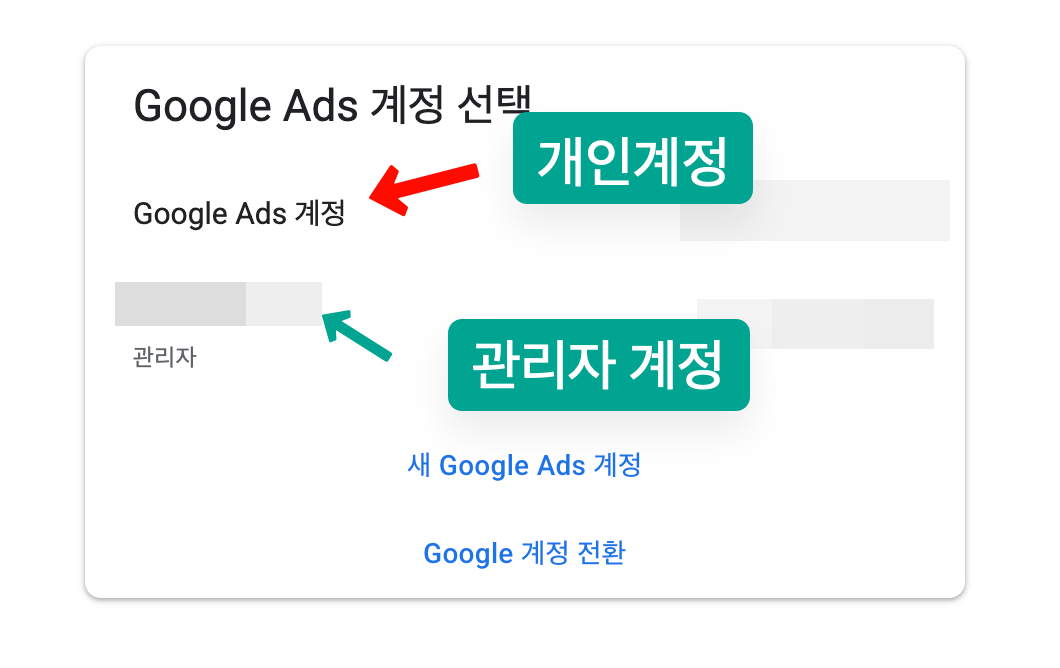 여기에서 구글 애즈 계정을 선택하라고 나오는데 나는 이전에 시행착오 겪고 이것저것 해보는 과정에서 원래 계정(개인계정) 1개와 관리자 계정 1개가 만들어졌다. 여기에서 기존 계정으로 하면 안되고 그 아래에 있는 `새 Google Ads 계정`을 클릭해서 새로운 계정을 만들어야한다.