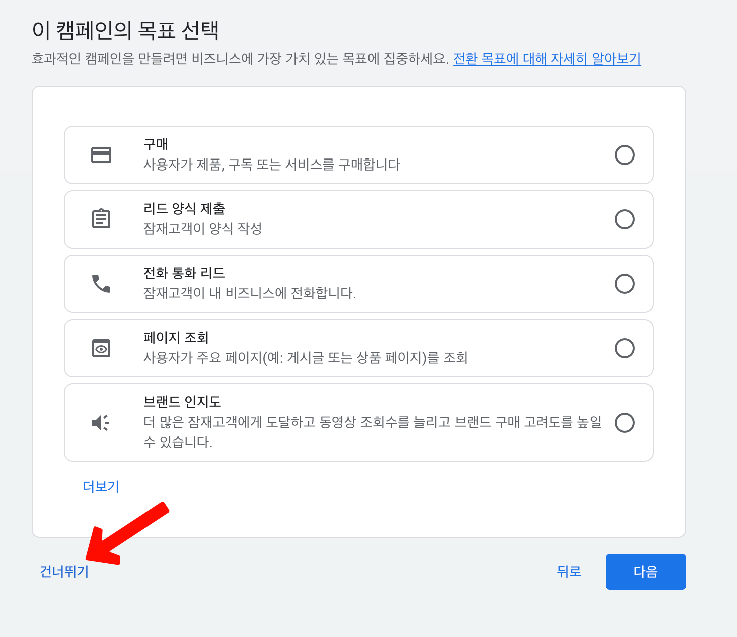 다음으로 캠페인 목표 선택하라는 창 있는데 이것도 그냥 `건너뛰기`눌러서 넘어간다. 알고봤더니 나중에도 다 설정할 수 있었다. 캠페인 유형도 그냥 건너뛰기 해주었다. 기능 많은건 좋은데 설정할게 너무 많고 엄청 복잡하게 느껴졌다. 내용에 압도당하는 기분.