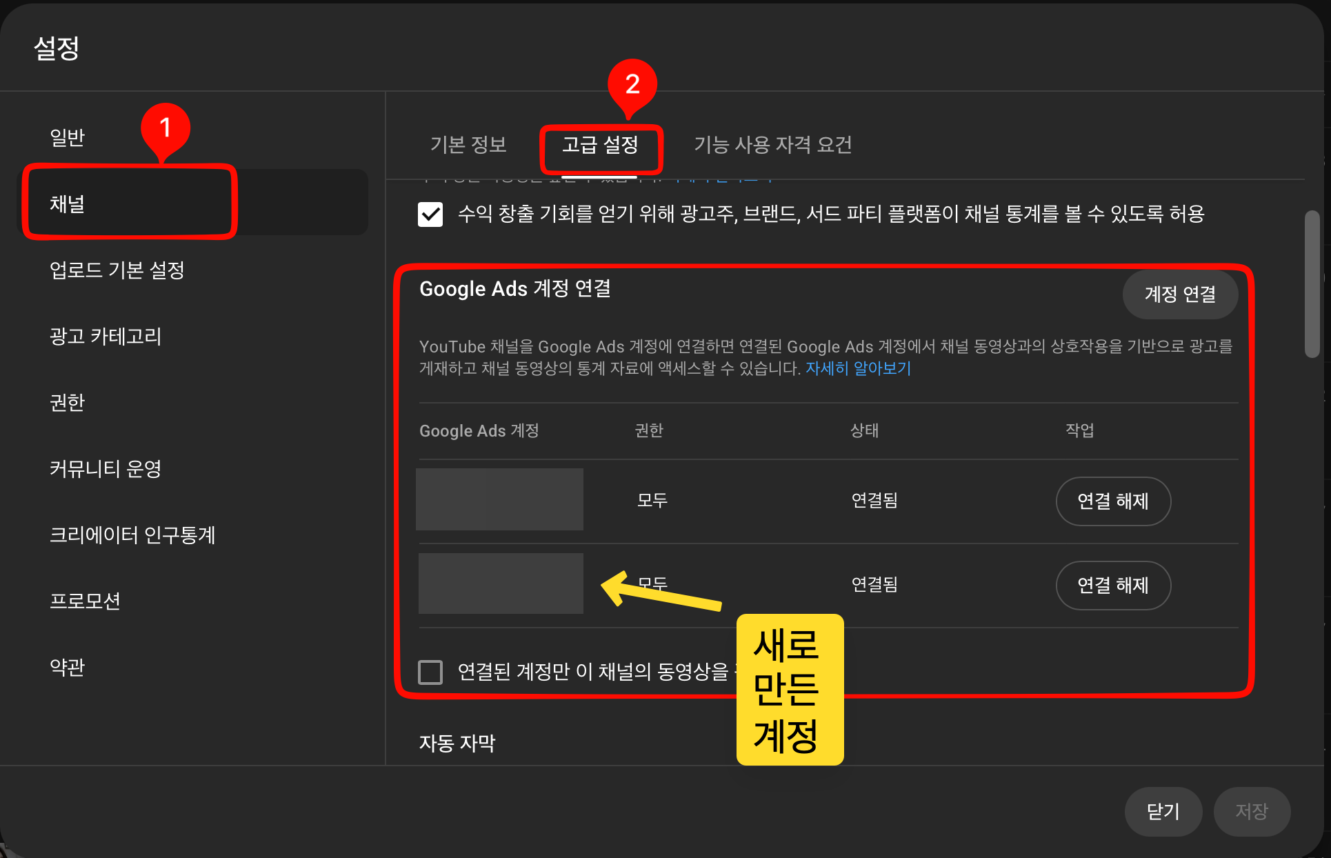 유튜브 채널에서 구글 애즈 계정 연결 확인