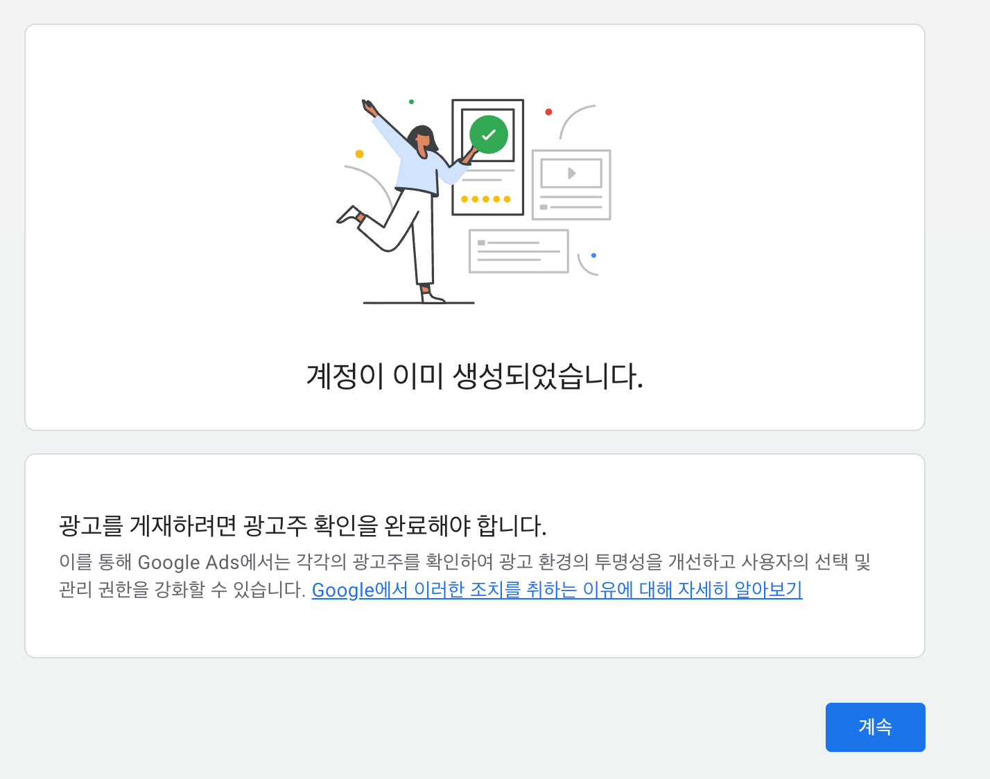 광고를 게재하려면 광고주 확인을 하라고하니까 `계속`을 눌러준다.