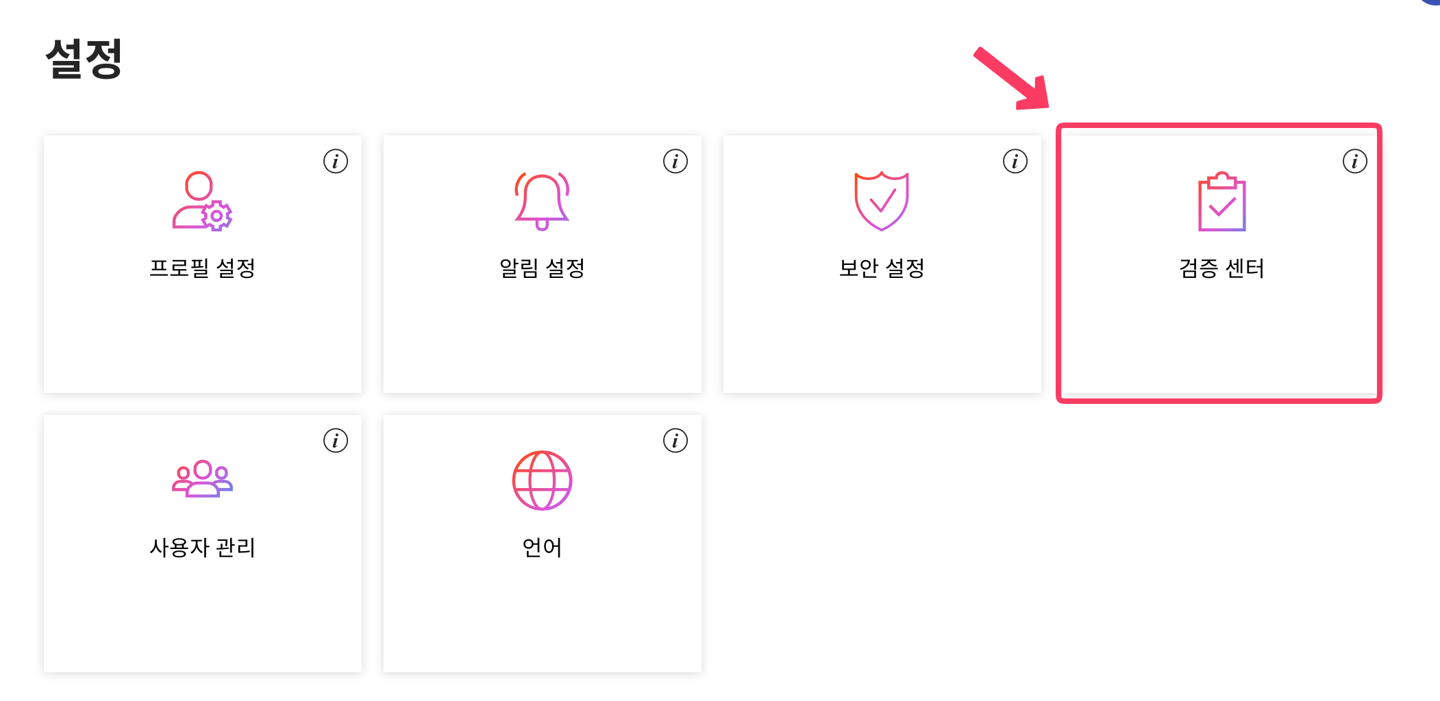 처음에 그냥 가입만 해두었던걸로 보인다. 계좌 정보 설정이나 신분증 증빙 같은게 하나도 안되어있었다. 그래서 `설정`에서 `검증센터`로 들어가서 등록해준다. 페이오니아 계정 설정에 대해서는 인터넷 검색 결과에도 딱 맞는 자료를 찾기가 힘들어서 이것저것 눌러보면서 진행했다.