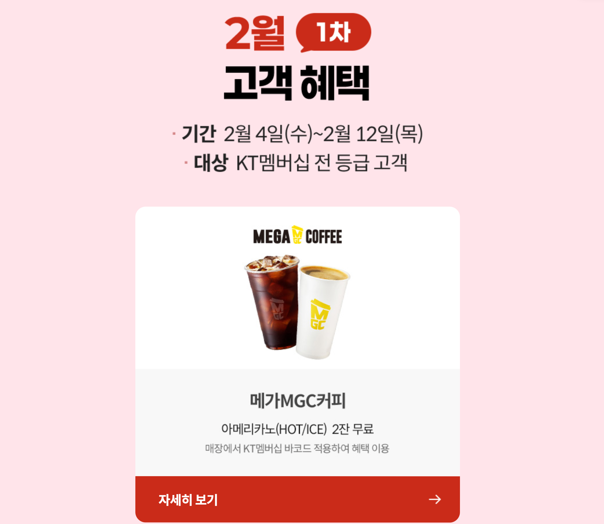 다음으로 KT 멤버십 인기 브랜드 할인 또는 무료 혜택. 이번에 2월 4일에 오픈되는건 메가커피 아메리카노 2잔 무료 혜택이다.
