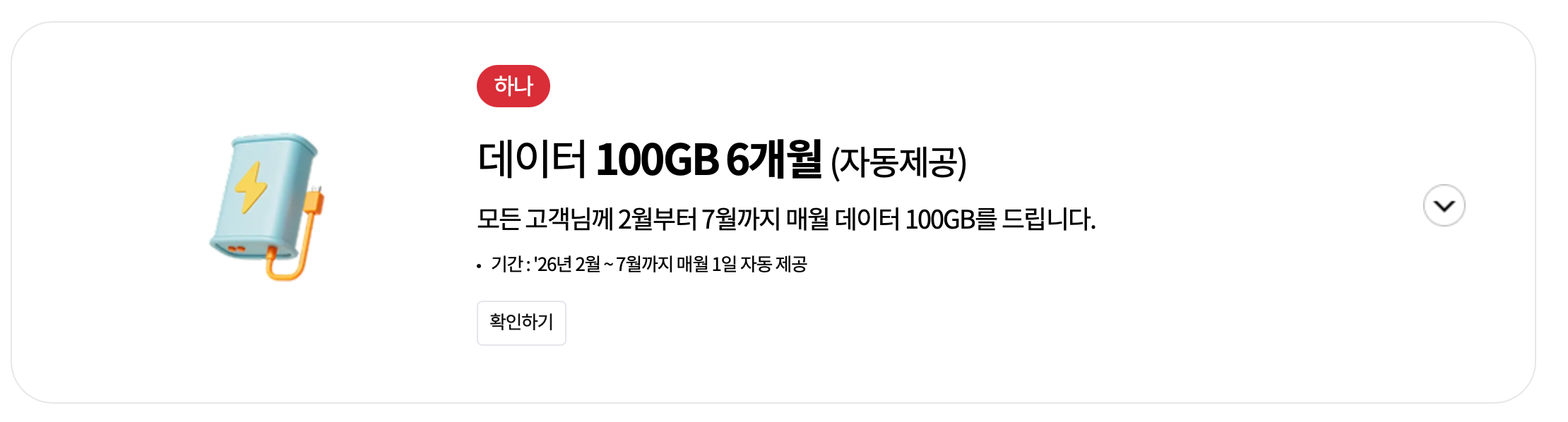 데이터 100기가 무료로 6개월 준다. 근데 나는 요금제에서 원래도 한달에 100기가인데 이거 거의 못쓰고 있어서 큰 의미는 없는 혜택이다. 와이파이 꺼놓고 써야하나싶다.