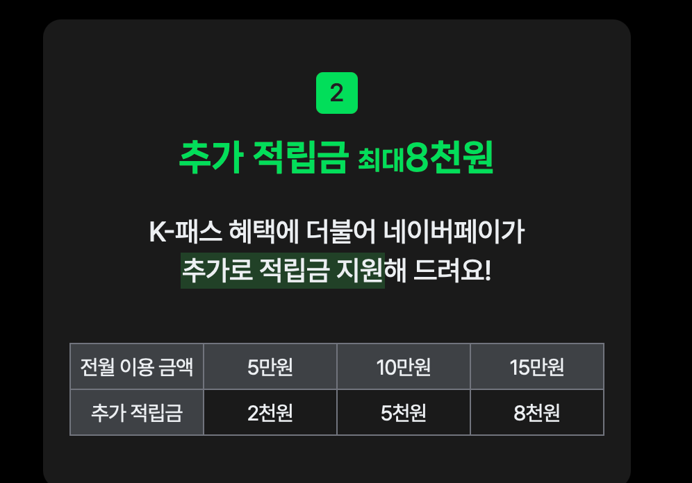 혜택은 신규 등록하면 3천원 주고, 추가 적립금으로 전월 이용 금액에 따라서 추가적립을 주는게 있다. 그런데 나는 대중교통으로만 이용할건데 여기에서 전월실적에 대중교통 이용금액을 포함해주는지는 네이버페이 K-패스 카드 화면에 안내가 안나와있었다. 나에겐 전월이용금액은 큰 의미는 없을 것 같고 처음에 주는 3천원 정도가 혜택이라면 혜택이었다.