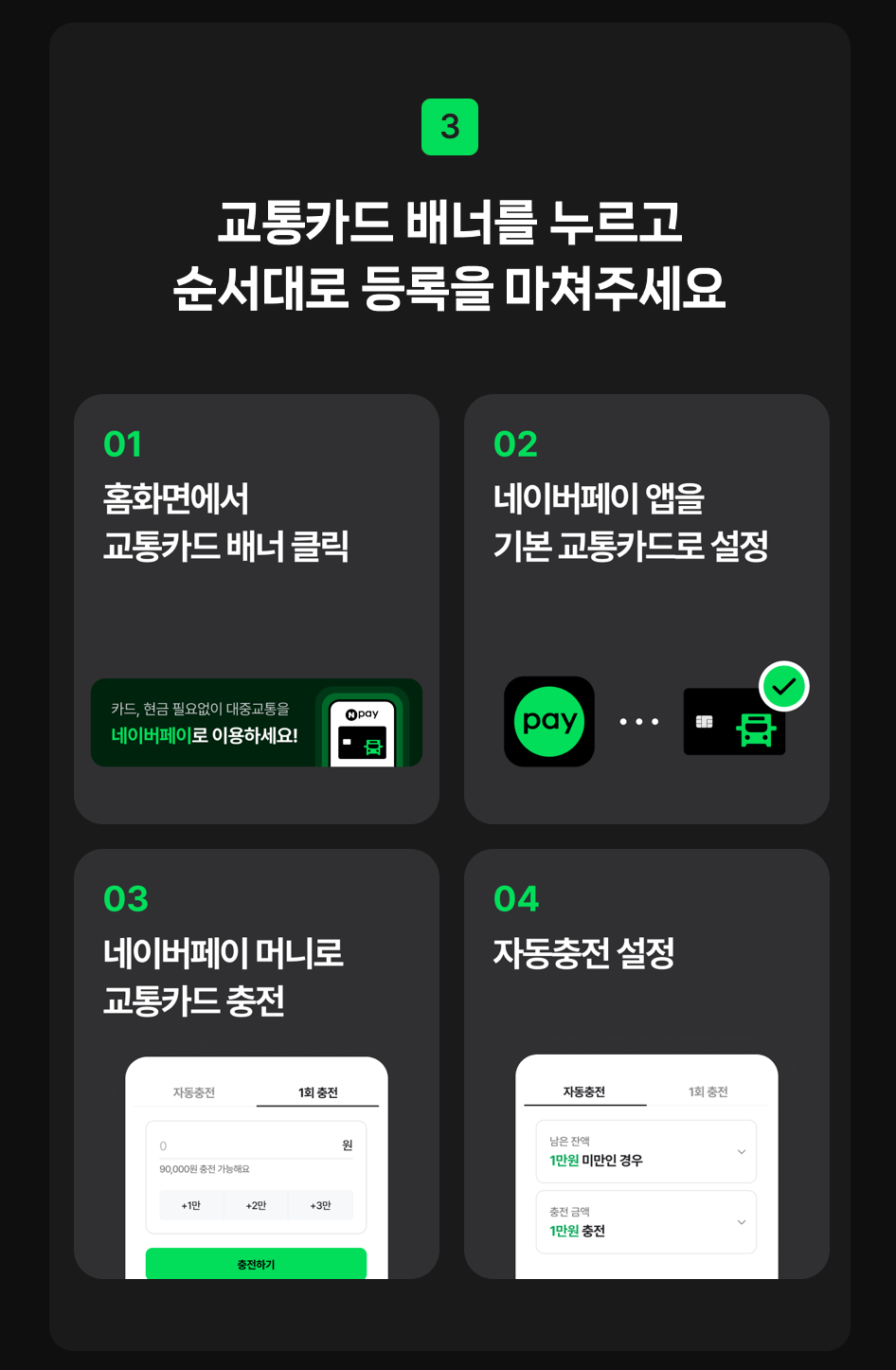 사용방법은 이렇게 되어 있고 간단하고 단순하다. 그래서 원래 K-패스 카드를 네이버페이 카드로 발급받으려고 계속 알아보고 있었는데... 치명적인 문제가 있었다. 네이버페이 K-패스 카드는 모바일 전용이었다...!! 즉, 워치에 등록해서 못 쓰는 것 같았다.