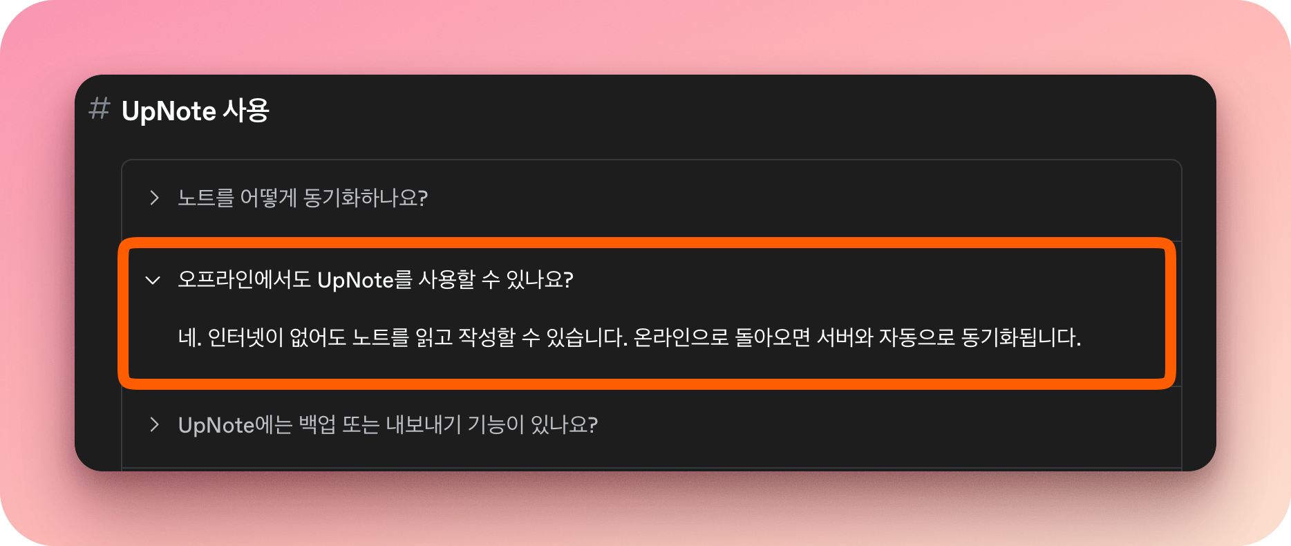 특히 유용한게 업노트는 오프라인에서도 쓸 수 있다. 나의 경우 강연하는 장소나 이런곳이 인터넷이 거의 되긴 하지만, 안될 때도 있고 와이파이 비번이 필요한 경우도 있는데 이때 LTE를 쓰면 되긴하지만 연결이 잘 안되는 경우가 왕왕 있어서 오프라인 접속 여부도 은근 중요한데 업노트는 그게 가능하다.
