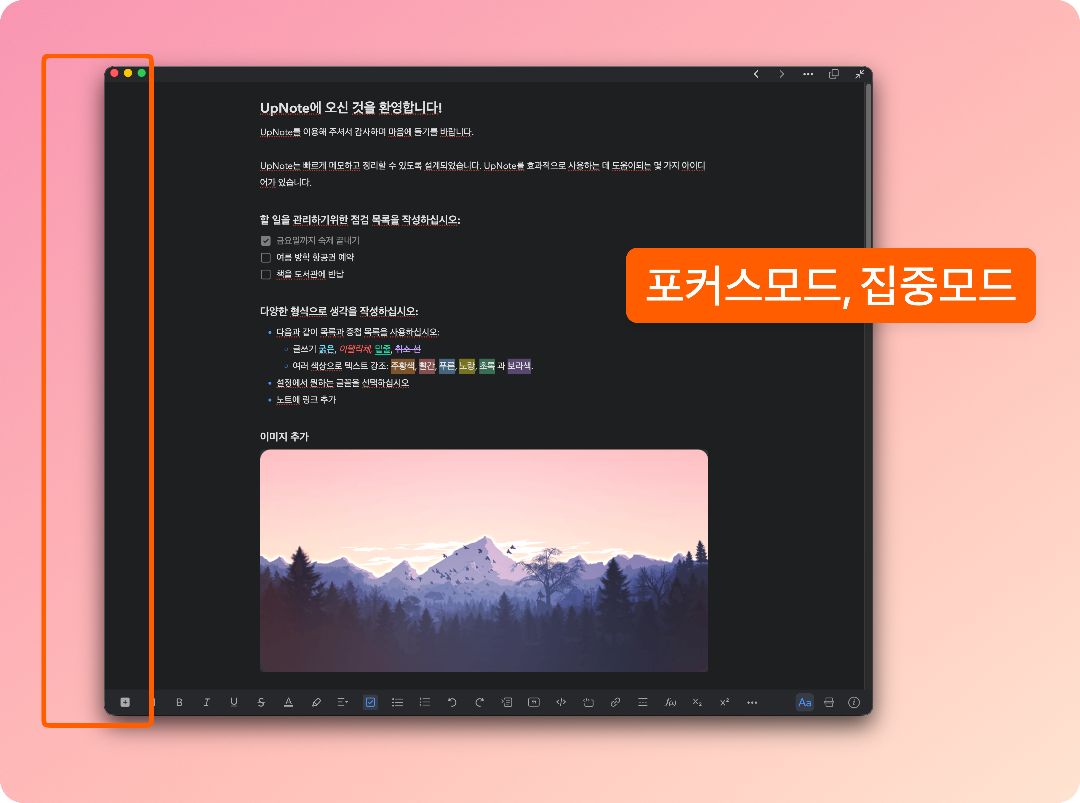 업노트에서 제공하는 포커스 모드(이건 PC나 맥, 아이패드에서만 제공되는 것 같다. 모바일은 원래부터도 포커스모드다)도 아주 유용하다. 단축키로도 포커스 모드를 껐다 켰다 할 수 있어서 더욱 좋다. 양 옆에 아무런 메뉴 같은게 안나오고 글쓰기 화면만 나오기 때문에 상당히 좋은 디자인이다.