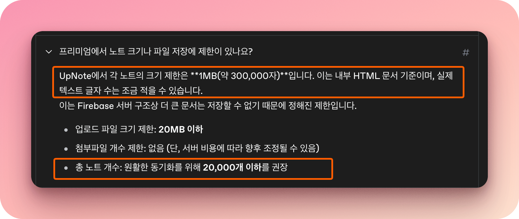업노트 노트 크기는 제한적이다. 이건 업노트의 단점이지만 비용을 생각하면 수긍할만하다. 각 노트 크기 제한은 1MB라고 한다. 업로드 파일 크기 제한은 20MB로 제한되어 있다. 나는 과거에 유튜브 썸네일 이미지 저장용으로 업노트를 이용했던적이 있는데 이것도 은근 나중에 귀찮아져서 그냥 jpg파일로 맥 자체에 저장해놓고 쓰게 되었고 더 이상 업노트에는 저장하지 않고 있다. 총 노트 개수는 2만개 정도 된다고 한다. 자료 아카이브 용도로는 2만개가 시간이 지나면 꽉 채워질 수도 있겠다. 나의 경우, 이제는 자료 아카이브 용도보다는 글쓰기 용도로 쓰려고 하고 있기 때문에 2만개면 충분한 수량이다.